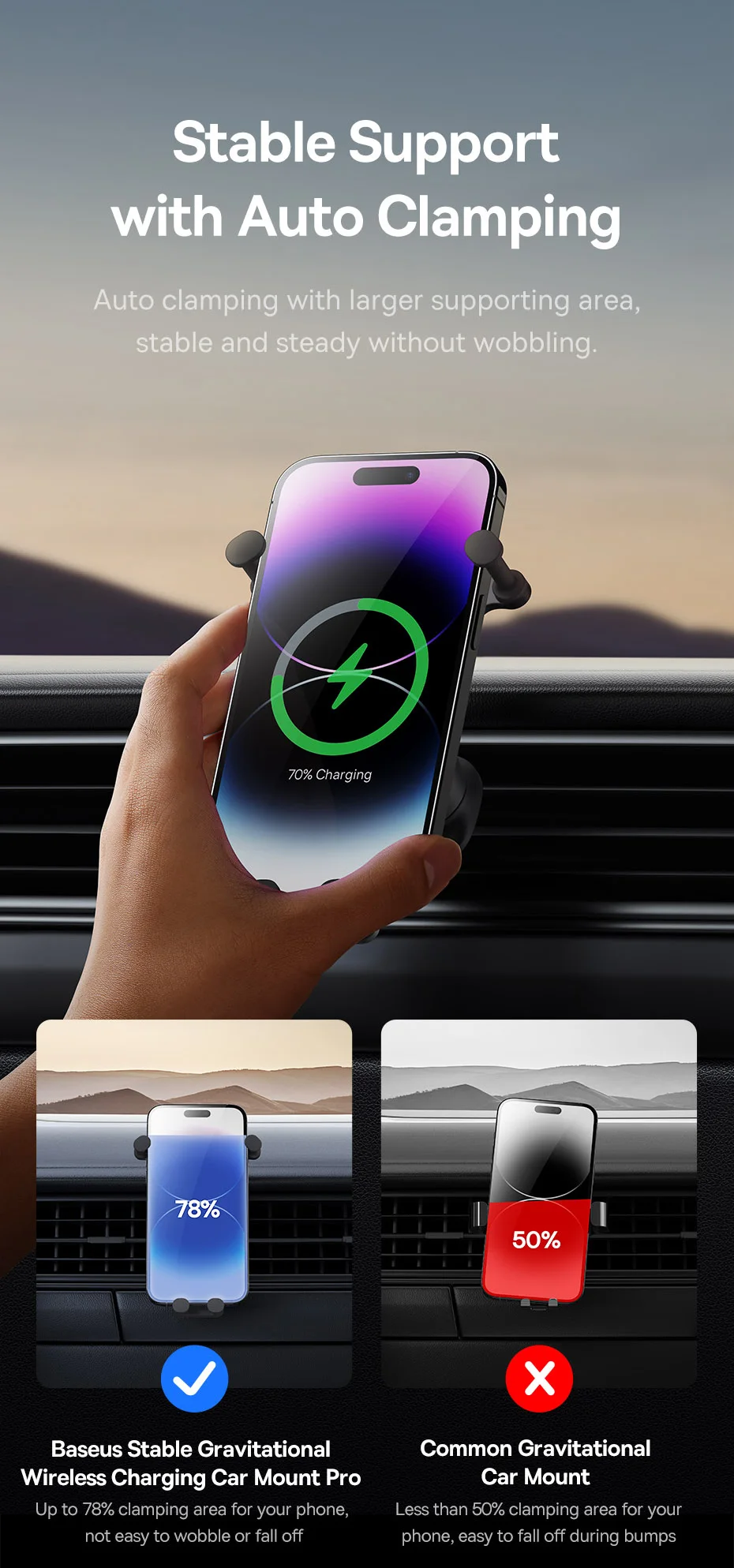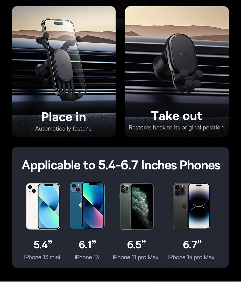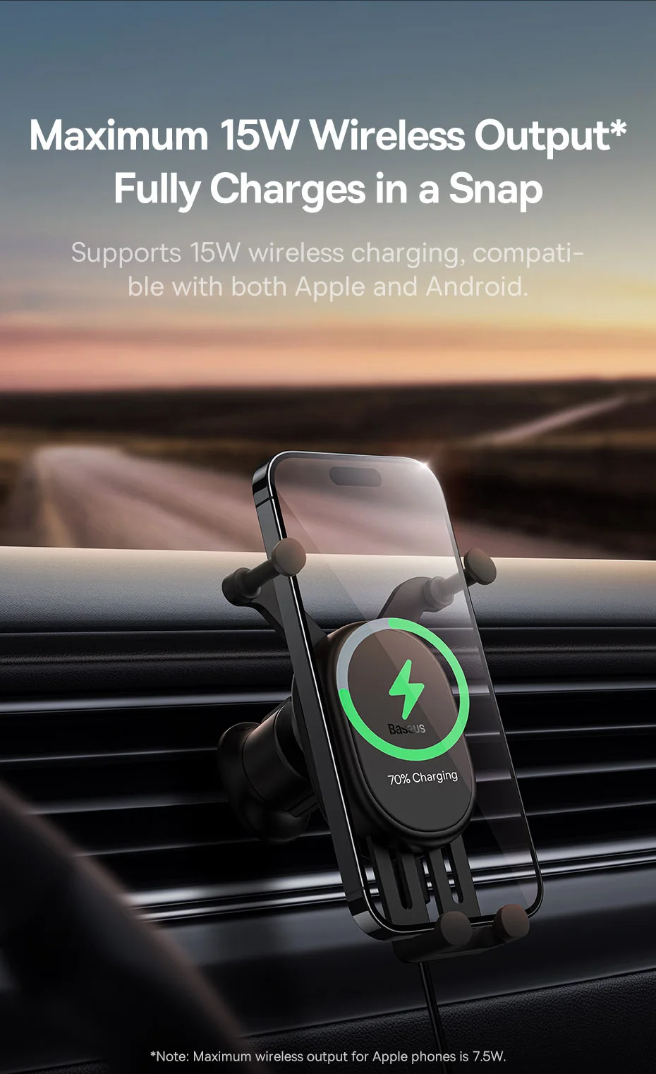 Auto Clamping with Wireless Charging Stable Gravitational Wireless Charging Car Mount Pro 15W (Air Outlet Version) 15W wireless flash charge* *Note: Maximum wireless output for Apple phones is 7.5W. Maximum 15W Wireless Output* Fully Charges in a Snap Supports 15W wireless charging,compatible with both Apple and Android. All New GravitationalStructure Firmer and More Secure Clamping Y-shaped gravitational structure, automatical-ly locks your phone in as you put it onto the mount. Applicable to 5.4-6.7 Inches Phones Stable Supportwith Auto Clamping Auto clamping with larger supporting area,stable and steady without wobbling. Grip with No Squeaking Finer structure offers a smooth and firmer grip without squeaking during driving. Larger Coil for Faster Charging Upgraded charging coil with larger inductionarea, drastically improving the charging efficiency. Advanced Chip forStable Fast Charging Smart chip with excellent temperature control,supports both Apple and Android, fully charges your phone in a snap. For Apple: 14,13,12,11,X and 8 series.... For Samsung: Galaxy S10,S10+, S9, S9+, S8, S8+...... For HUAWEI: Mate40 series, Mate30 series...... For Xiaomi: 11, 10 series, 9 series, MIX3,MIX2S...