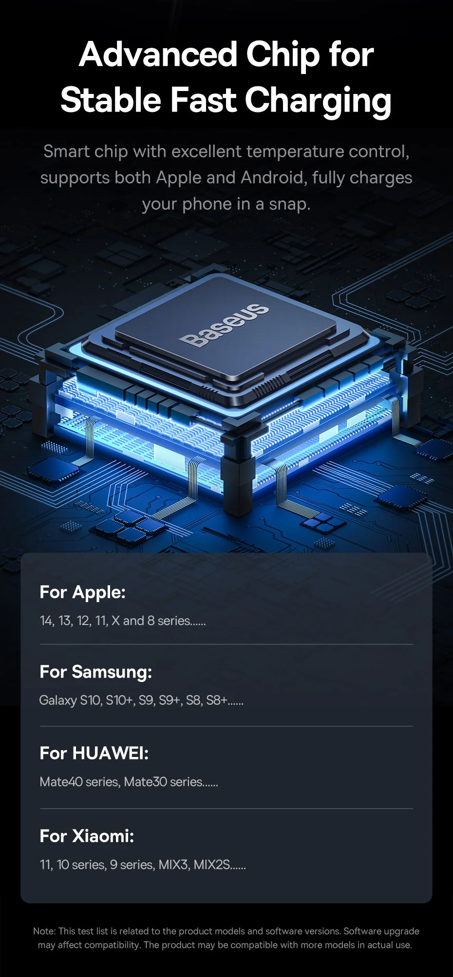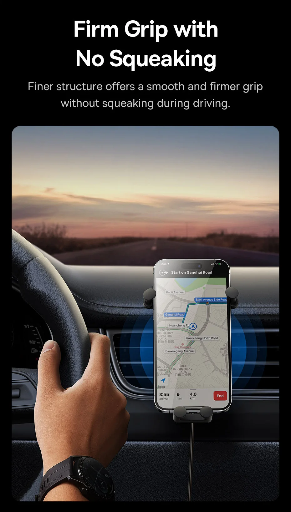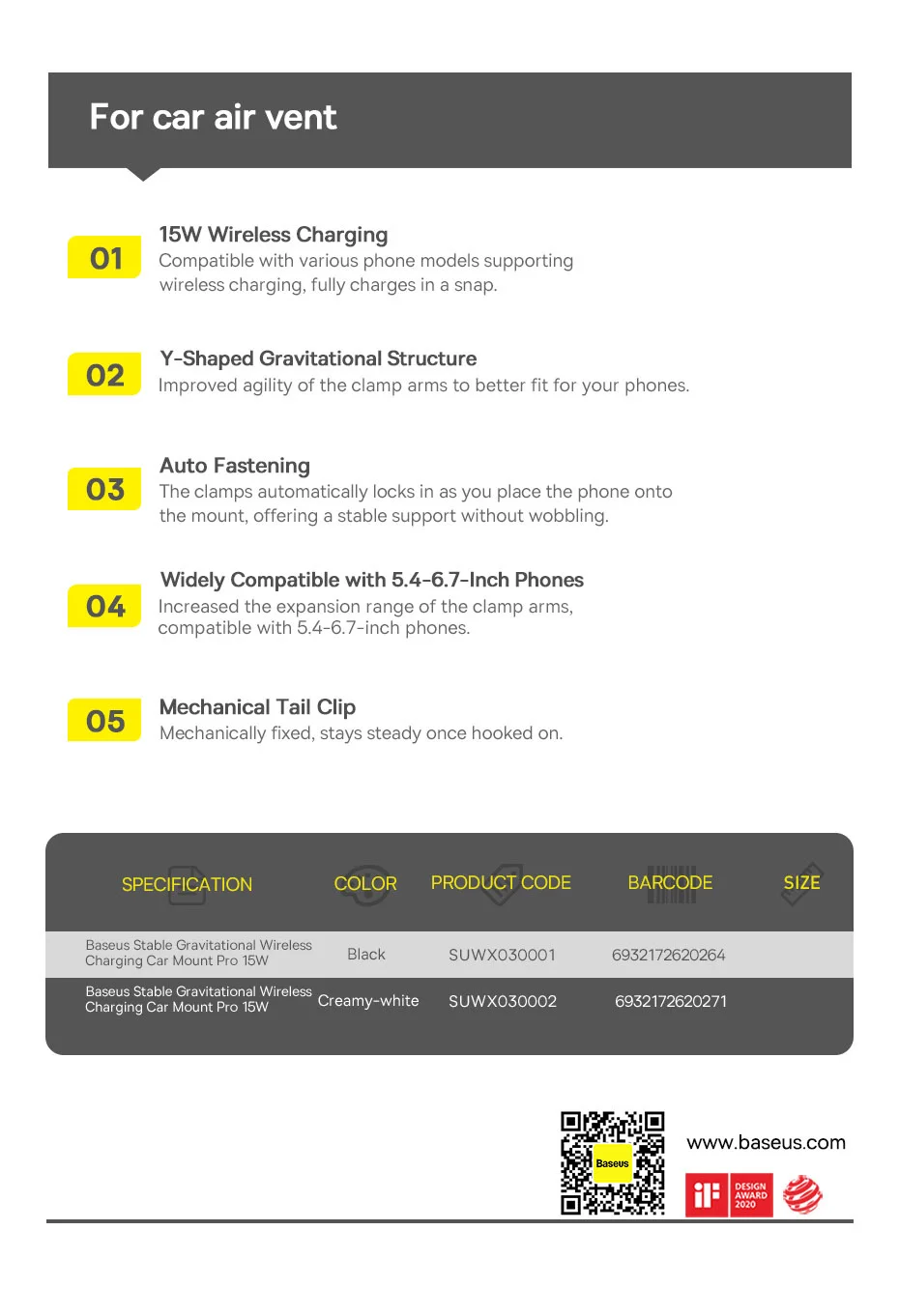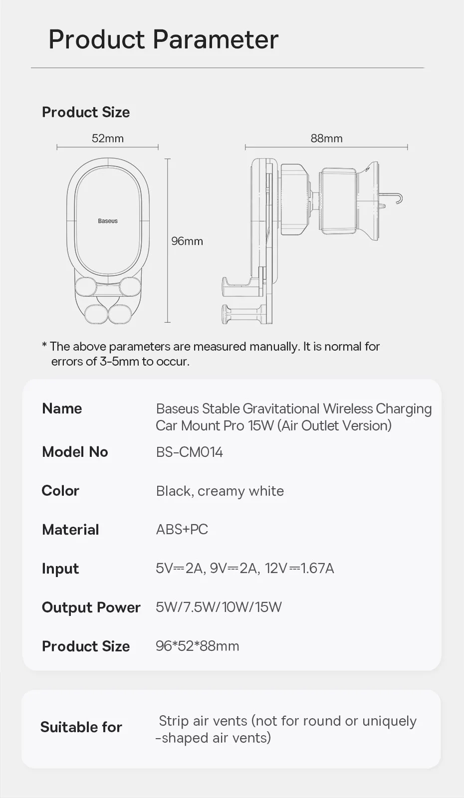 Auto Clamping with Wireless Charging Stable Gravitational Wireless Charging Car Mount Pro 15W (Air Outlet Version) 15W wireless flash charge* *Note: Maximum wireless output for Apple phones is 7.5W. Maximum 15W Wireless Output* Fully Charges in a Snap Supports 15W wireless charging,compatible with both Apple and Android. All New GravitationalStructure Firmer and More Secure Clamping Y-shaped gravitational structure, automatical-ly locks your phone in as you put it onto the mount. Applicable to 5.4-6.7 Inches Phones Stable Supportwith Auto Clamping Auto clamping with larger supporting area,stable and steady without wobbling. Grip with No Squeaking Finer structure offers a smooth and firmer grip without squeaking during driving. Larger Coil for Faster Charging Upgraded charging coil with larger inductionarea, drastically improving the charging efficiency. Advanced Chip forStable Fast Charging Smart chip with excellent temperature control,supports both Apple and Android, fully charges your phone in a snap. For Apple: 14,13,12,11,X and 8 series.... For Samsung: Galaxy S10,S10+, S9, S9+, S8, S8+...... For HUAWEI: Mate40 series, Mate30 series...... For Xiaomi: 11, 10 series, 9 series, MIX3,MIX2S...
