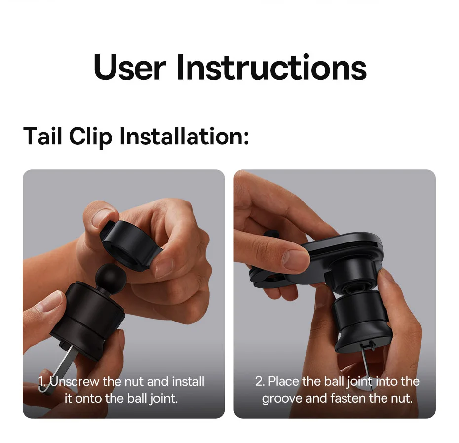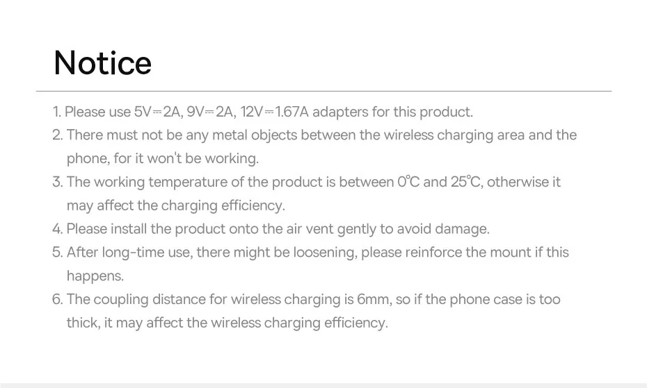 Multiple Safety Protections Safe and Reliable Protects your battery with safer wireless charging. Sturdy Mechanical Tail Hook A tail hook securely snaps onto the blade. 360° AdjustableViewing Angle A smooth ball head joint offers an omnidirectional adjustment for the viewing angle. Wireless Chargingwith the Case on 6mm charging distance with responsive induc-tion, won't affect the charging speed even with the case on. Notice 1.Please use 5V-2A,9V-2A,12V-1.67A adapters for this product. 2.There must not be any metal objects between the wireless charging area and thephone, for it won't be working. 3.The working temperature of the product is between 0℃ and 25℃, otherwise itmay affect the charging efficiency. 4.Please install the product onto the air vent gently to avoid damage. 5.After long-time use, there might be loosening, please reinforce the mount if thishappens. 6.The coupling distance for wireless charging is 6mm, so if the phone case is toothick, it may affect the wireless charging efficiency.