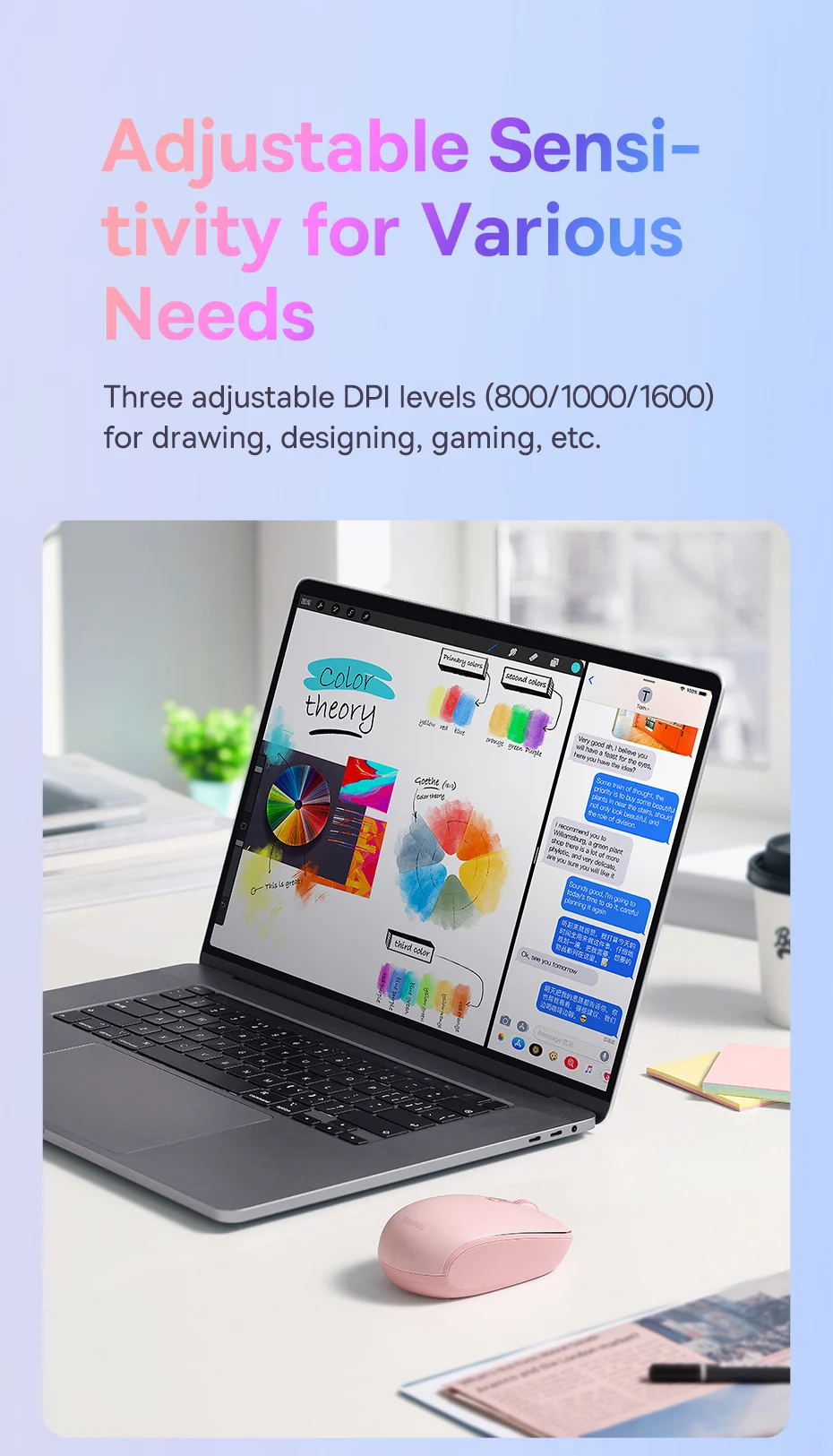 Three adjustable DPl levels (800/1000/1600)for drawing, designing, gaming, etc.