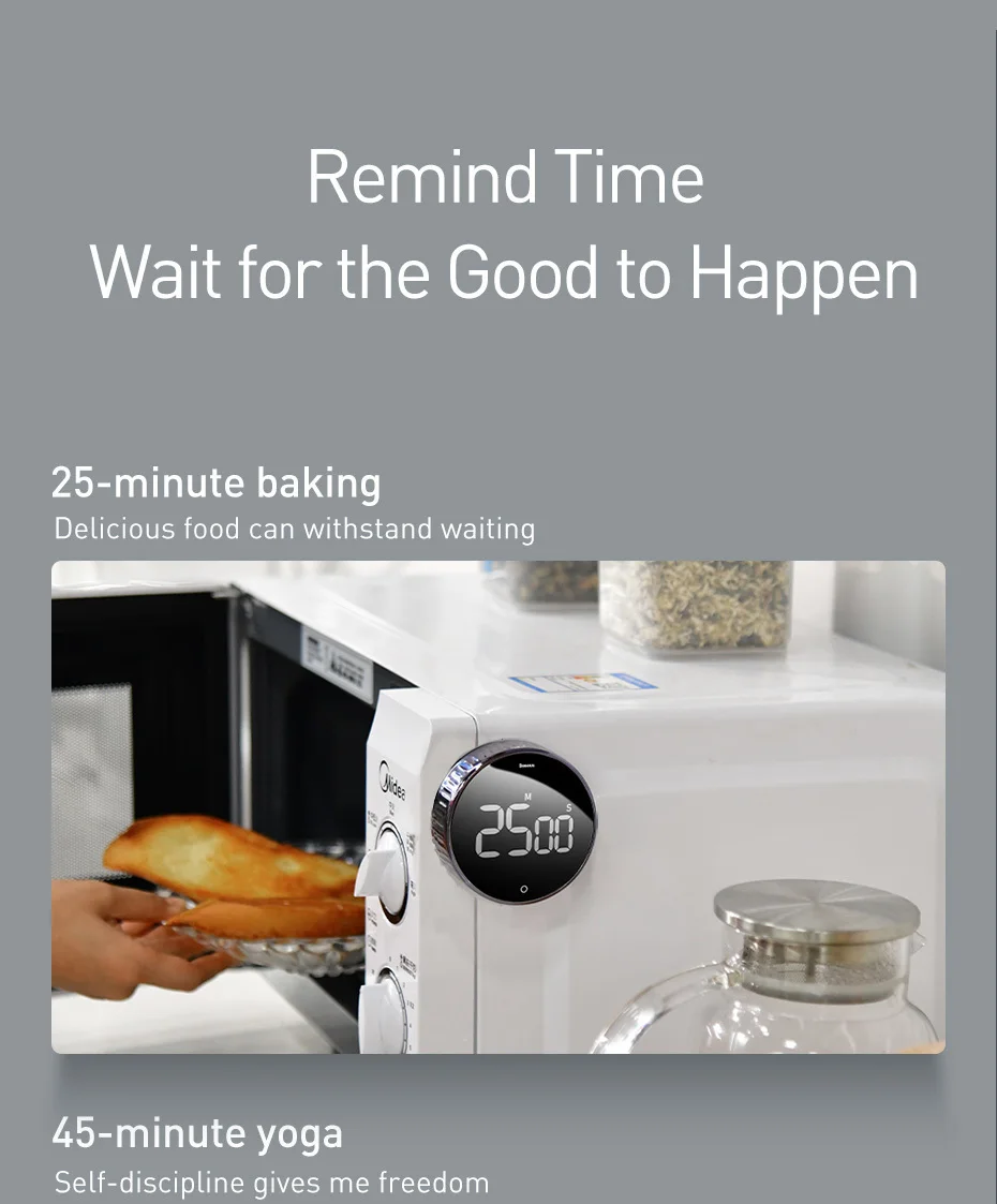 Configuración de Cuenta atrás: Gire la perilla para establecer el tiempo de cuenta atrás deseado. Gire a la derecha para aumentar el valor y gire a la izquierda para disminuir el valor. (El Valor de minuto se puede establecer Cuando la rotación es rápida y el ángulo es superior a 60 grados)