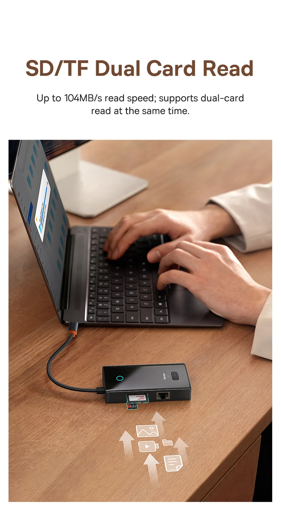 Hasta 104 MB/s de velocidad de lectura; admite la lectura de doble tarjeta al mismo tiempo.