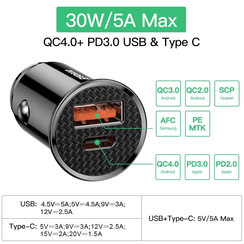 Comprar Baseus USB cargador de coche carga rápida 4,0 QC4.0 QC3.0 PPS SCP 5A PD tipo C 30W cargador USB de coche rápido para iPhone Xiaomi teléfono móvil