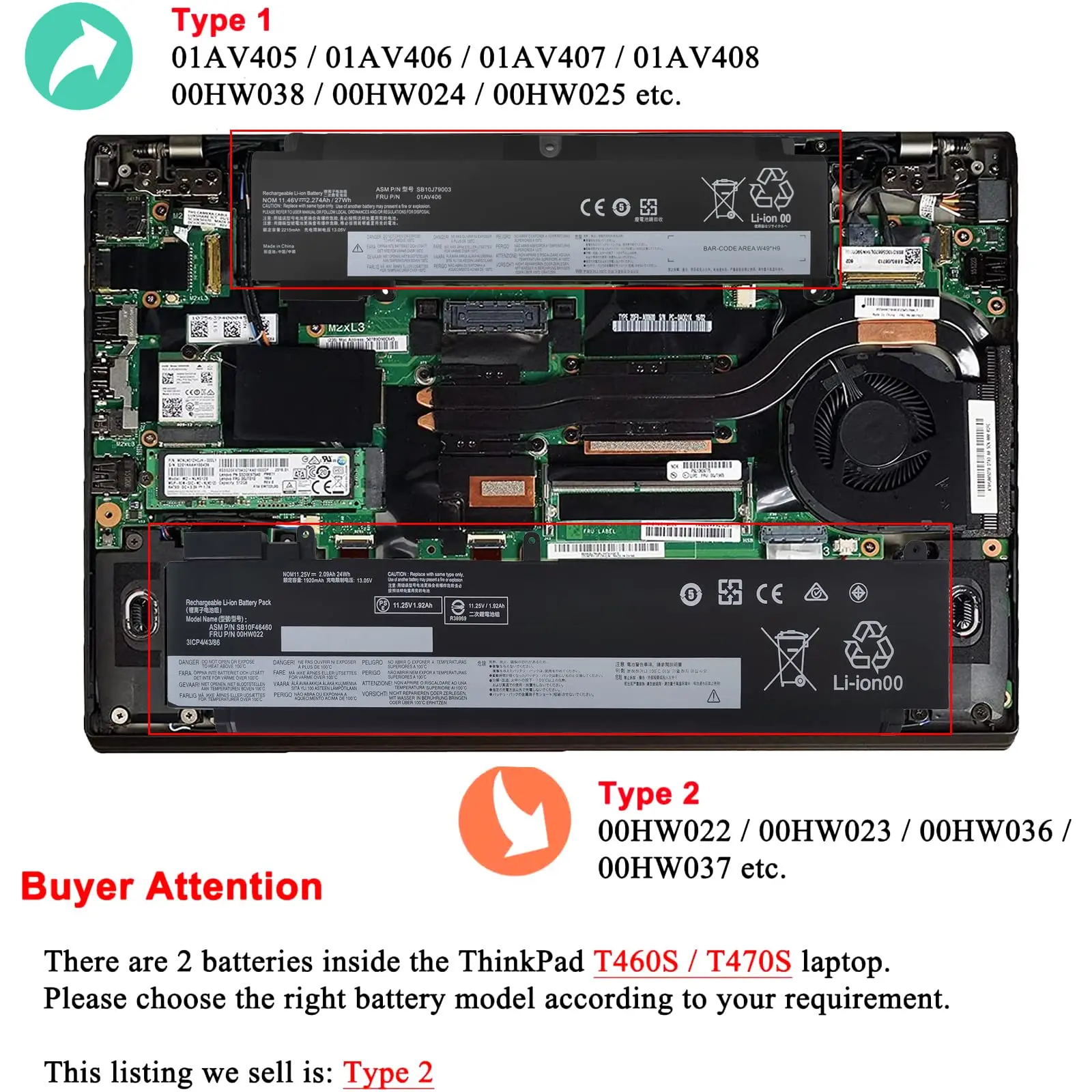 Nota importante:Hay dos baterías en la computadora portátil T460S/T470S, asegúrese de cuál va a reemplazar y luego elija el modelo de batería correcto de acuerdo con la batería original de su computadora portátil.