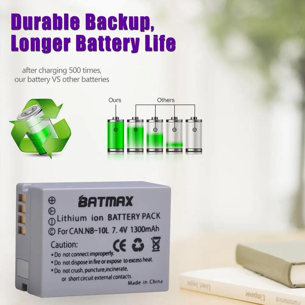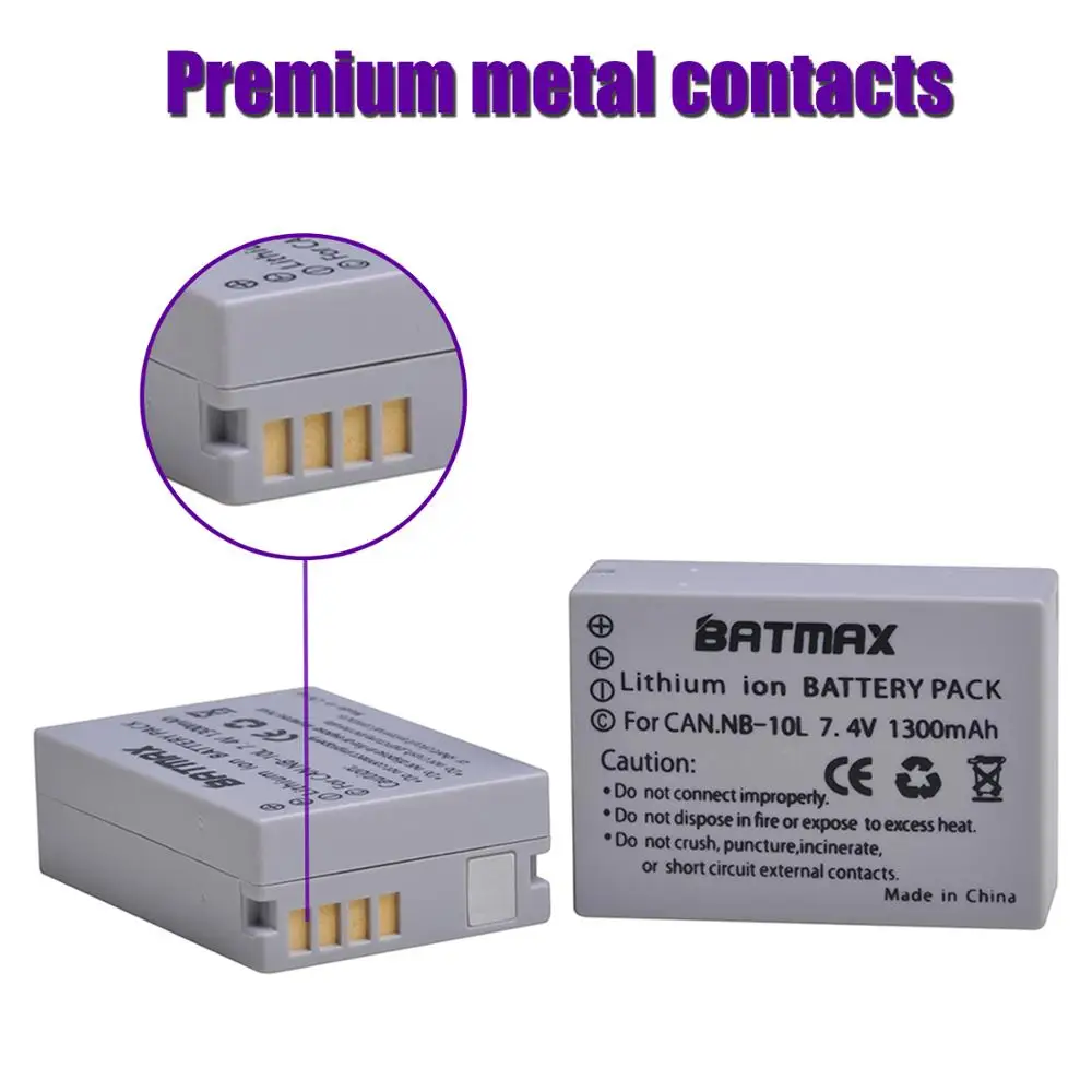 Batmax NB-10L NB10L Camera Battery+New LED Dual Charger with Type C Port for Canon G1X G15 G16 SX40HS SX50HS SX60HS SX40 SX50 SX60 HS