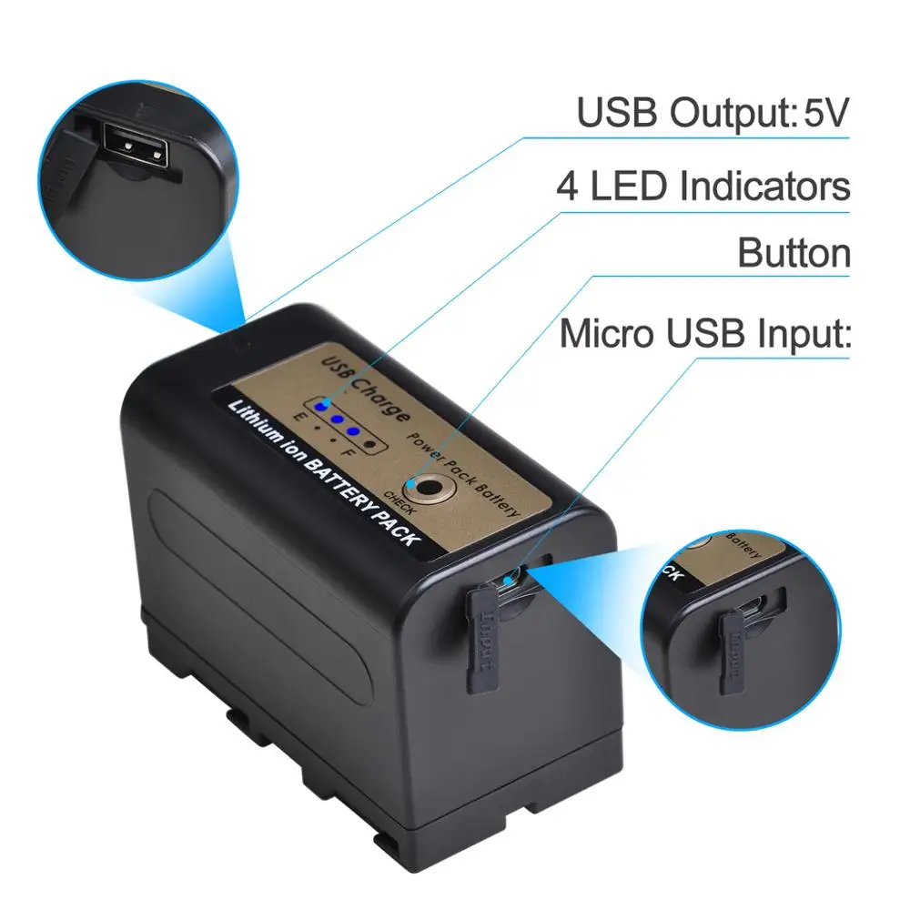 Nuevo diseño:1.Batería NP-F770/NP-F750 con puerto de salida USB y puerto de entrada USB.2. Como banco de energía para todo tipo de teléfonos inteligentes. Compatible con múltiples fuentes de entrada.3.Con indicadores de alimentación LED para mostrar el estado de energía de la batería", E" significa que no hay electricidad, " F" significa potencia total. Puede verificar claramente el estado de energía de "E" a "F" con cuatro indicadores de alimentación LED.Compatible con:Para luz de vídeo LED YONGUO, luz de vídeo LED Godox y otras luces de vídeo LED.Para cámara Sony:CCD-SC5 CCD-SC55 CCD-SC65 DCR-SC100 CCD-TR910CCD-TR917 CCD-TR940 CCD-TRV101 CCD-TRV15 CCD-TRV215CCD-TRV25 CCD-TRV36 CCD-TRV57 CCD-TRV58 CCD-TRV615CCD-TRV62 CCD-TRV65 CCD-TRV66 CCD-TRV67 CCD-TRV68CCD-TRV715 CCD-TRV72 CCD-TRV75 CCD-TRV81DCR-TRV103 DCR-TRV110 DCR-TRV110k DCR-TRV130DCR-TRV210 DCR-TRV220k DCR-TRV310k DCR-TRV315DCR-TRV320 CR-VX2000 CR-VX2100 CR-VX2100EMVC-FD100 MVC-FD200 MVC-FD5 MVC-FD51 MVC-FD71MVC-FD73 MVC-FD73K MVC-FD75 MVC-FD91 MVC-FD92MVC-FD95 MVC-FD97Nota: no se puede utilizar para Ring Flash LightLista de paquetes: