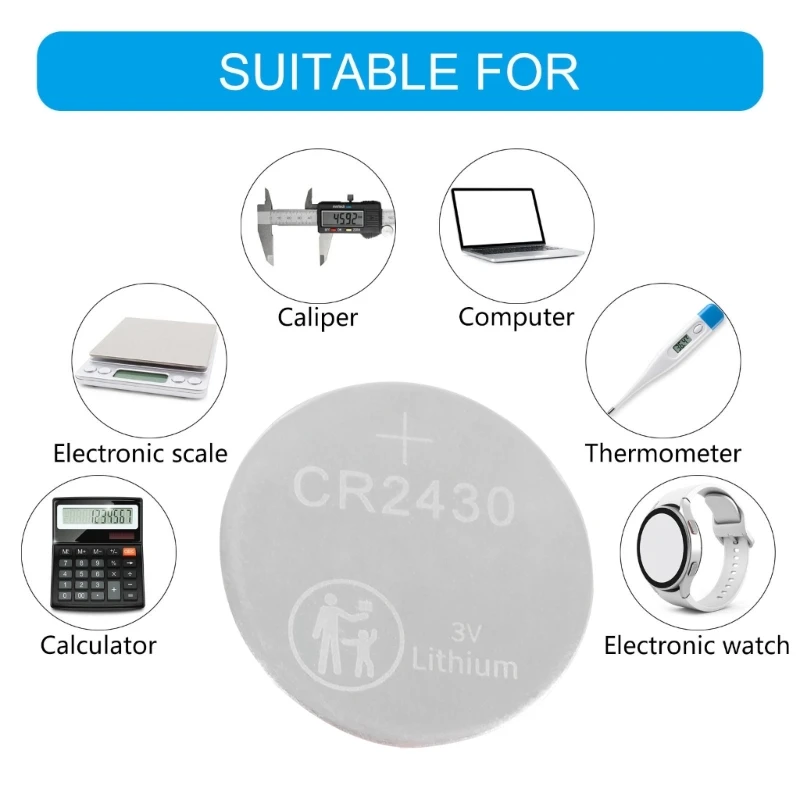 Esta batería CR2430 no recargable cuenta con una construcción metálica duradera y está diseñada para evitar fugas, garantizando seguridad y eficiencia.