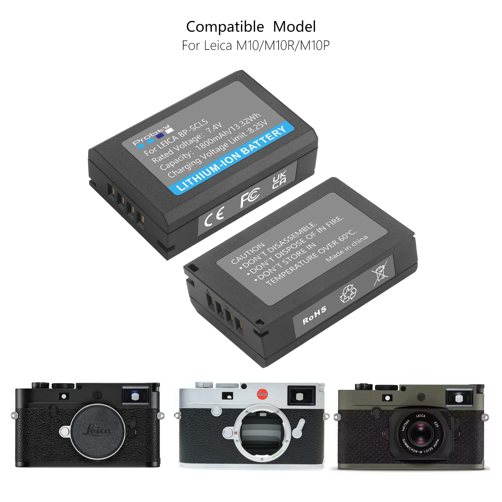 Características:1.Nueva batería genérica recargable de iones de litio.2.Alta densidad de energía, alta vida útil de reciclaje, batería de larga duración.3.Potencia adicional para tu cámara de vídeo digital/videocámara.4.Batería de iones de litio recargable/de alta capacidad con celda premium.Especificaciones de la batería:Modelo de batería: BP-SCL5 para cámara LeicaVoltaje: 7,4 VCapacidad: 1800 mAh/13,32 WhTipo de batería: batería recargable de iones de litioBatería para Leica:BP-SCL5Modelo compatible:Para Leica M10/M10R/M10P
