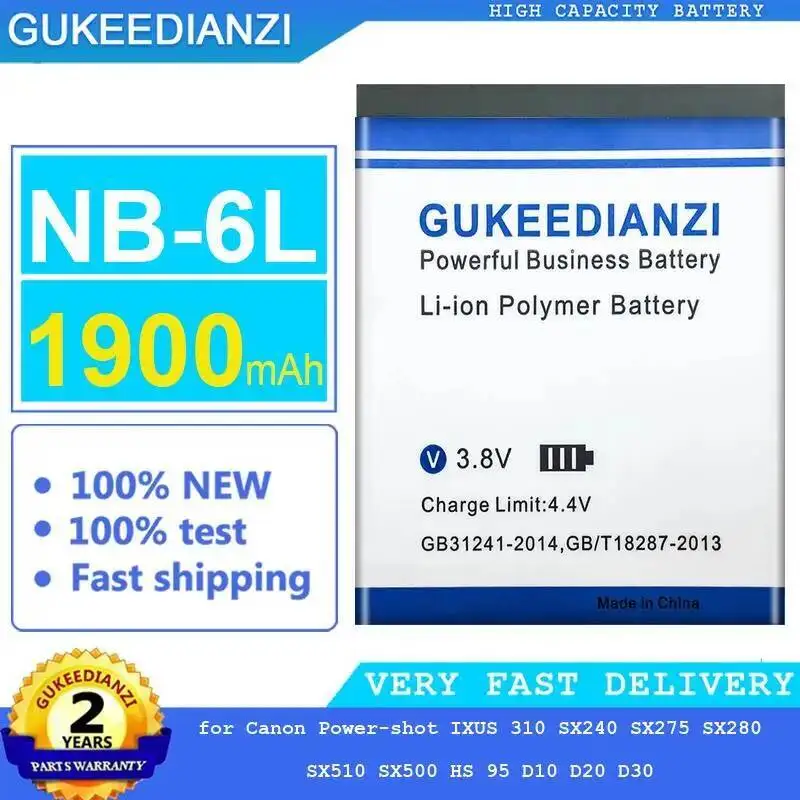 Batería de cámara de alta capacidad y eficiencia 1900mAh para Canon Powershot IXUS 310 SX240 SX275 SX280 SX510 SX500 HS 95 D10 D20 D30 NB-6L