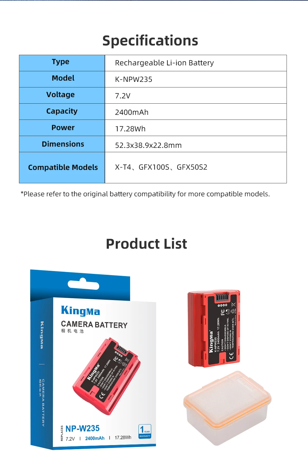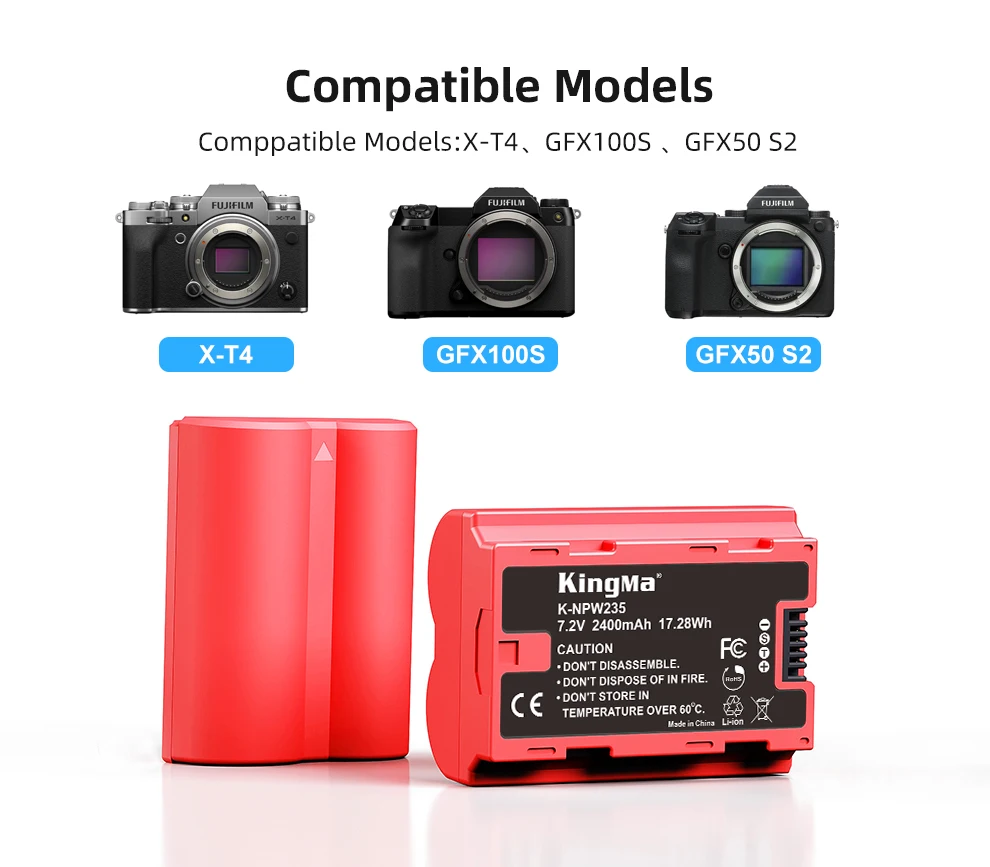 Reemplazo perfecto para Fujifilm NP-W235 pulgadas X-T4, GFX100S, GFX50S II, X-T5, X-H2, X-H2S, X-T3, X-T4, X-S10, X-S20, X-T30, X-T30 II, X-T50, X100VI y cualquier modelo con alimentación NP-W235.
