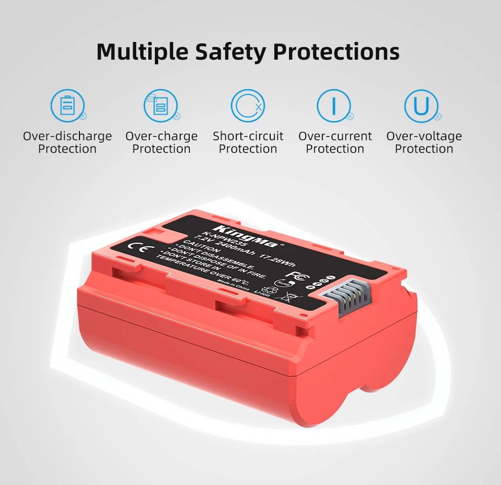 Las protecciones integradas contra sobredescarga, sobrecarga, cortocircuito, sobrecorriente y sobretensión mantienen la cámara y la batería seguros.