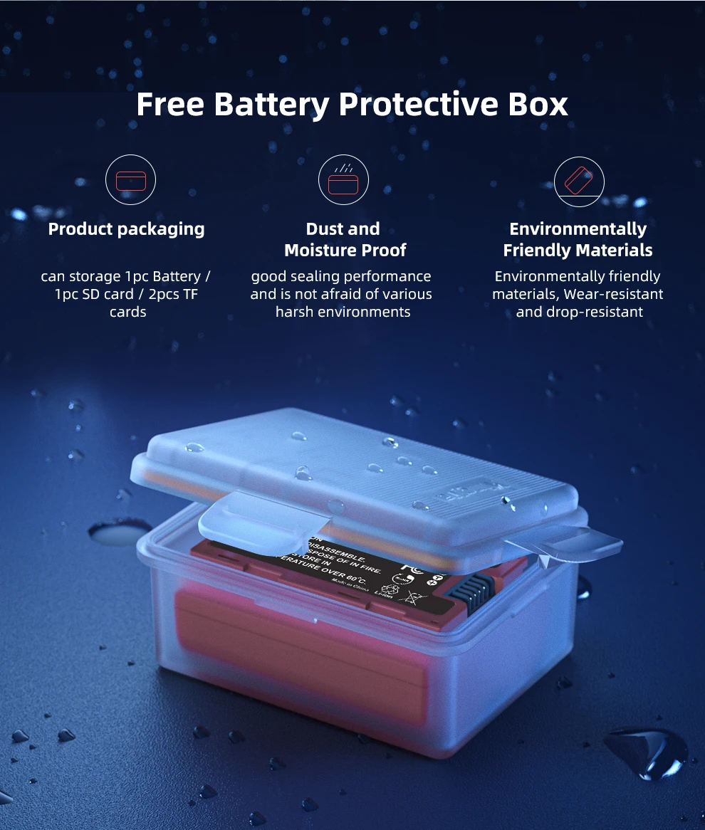 Incluye un estuche duradero, resistente al polvo y la humedad, fabricado con materiales ecológicos y resistentes a caídas para transportar una batería más tarjetas de memoria de forma segura.