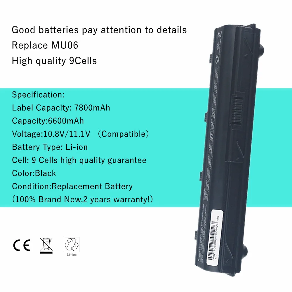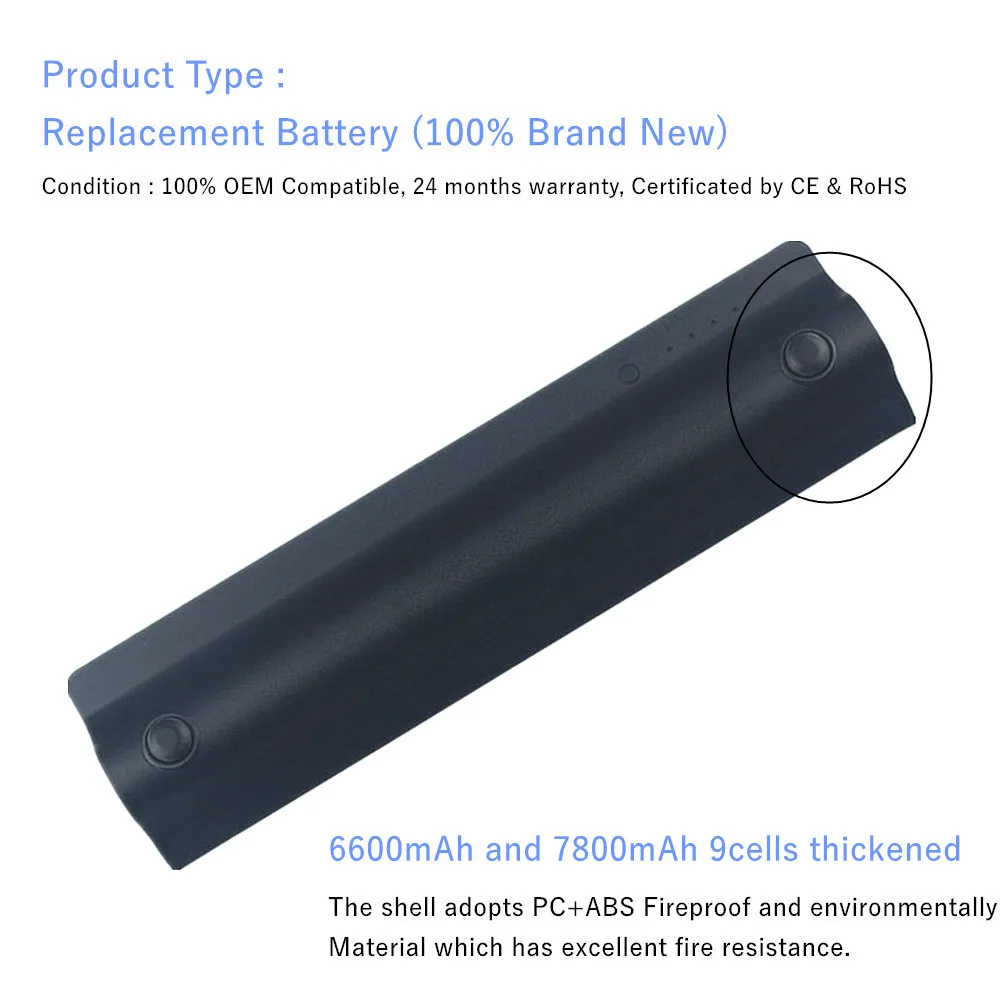 Battery Type:---------------------------------------------------Li-ionBattery Volt:----------------------------------------------------10.8V/11.1VLabel capacity ---------------------------------------------7800MAHpublicize capacity---------------------------------------------7800MAHFull Capacity;-------------------------------------------------6600MAHBattery Cells---------------------------------------------------9 cellsBattery Color:--------------------------------------------------BlackInventory: -------------------------------------------------------In Stock