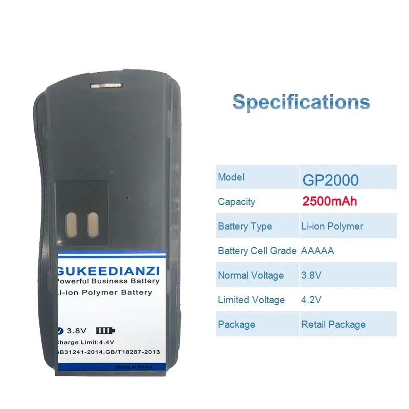 ※Modelo de batería: GP2000 (PMNN4063BR)※Capacidad: 2500 mAh※Ajuste: Para MOTOROLA P020 P030 CP125 VL130 PRO2150 GP2000 AXU4100 AXV5100 GP2100 P2150 BC120 PMNN4046 PMMN4063ARC