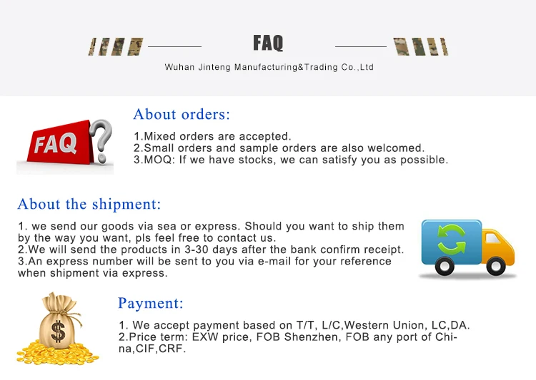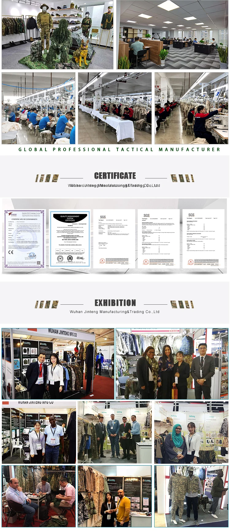 Wuhan Jinteng fabricación y negociación Co., Ltdfue fundada en enero de 10 2002, y es un fabricante especializado de tácticoprendas y productos de protección para exteriores.Cubre una superficie de 7800 metros cuadrados, con 5600 metros cuadrados de talleres de producción y almacenes.Además, posee más de 200 trabajadores calificados y una gran cantidad de personal profesional de tecnología y gestión, que está equipado con equipos modernos y modo de gestión avanzado.Los principales productos de nuestra fábrica son los siguientes: varios tácticouniformes, chaquetas de campo, pantalones con múltiples bolsillos, abrigos de lana, chalecos tácticos, impermeables, suéteres, camisas, gorras, cinturones, botas, productos antibalas y monos.Su capacidad anual ha alcanzado casi 20 millones de piezas.