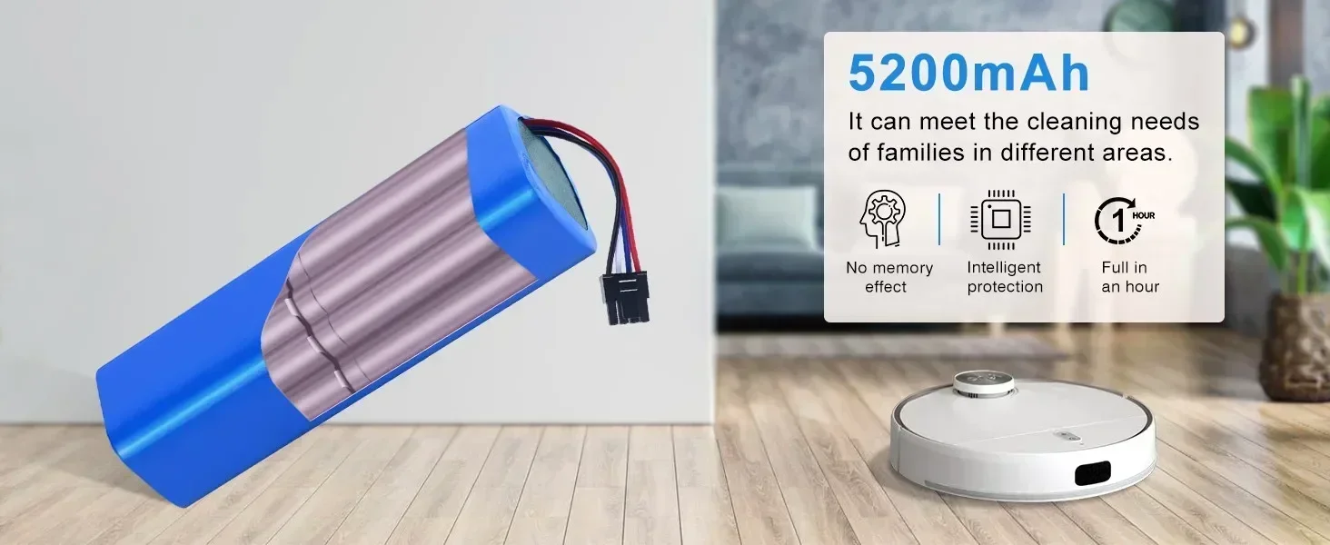 【INFORMACIÓN DEL PRODUCTO】 Voltios: 14,4 V, Capacidad: 5200 mAh, Tipo: Li-ion. La batería de alta capacidad proporciona a su aspiradora robótica energía estable y consistente para un rendimiento de limpieza óptimo. Tiempos de ciclo: ≥500 ciclos; Tiempo de ejecución: ≥60 minutos por carga.