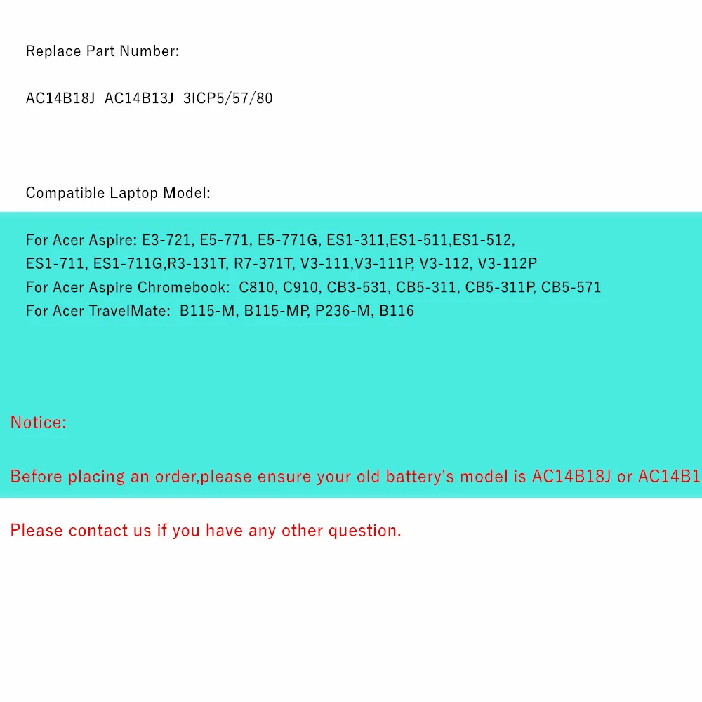 Antes de realizar un pedido, asegúrese de que el modelo de su batería anterior sea AC14B18J (11,4 V 3220 mAh/36 WH).