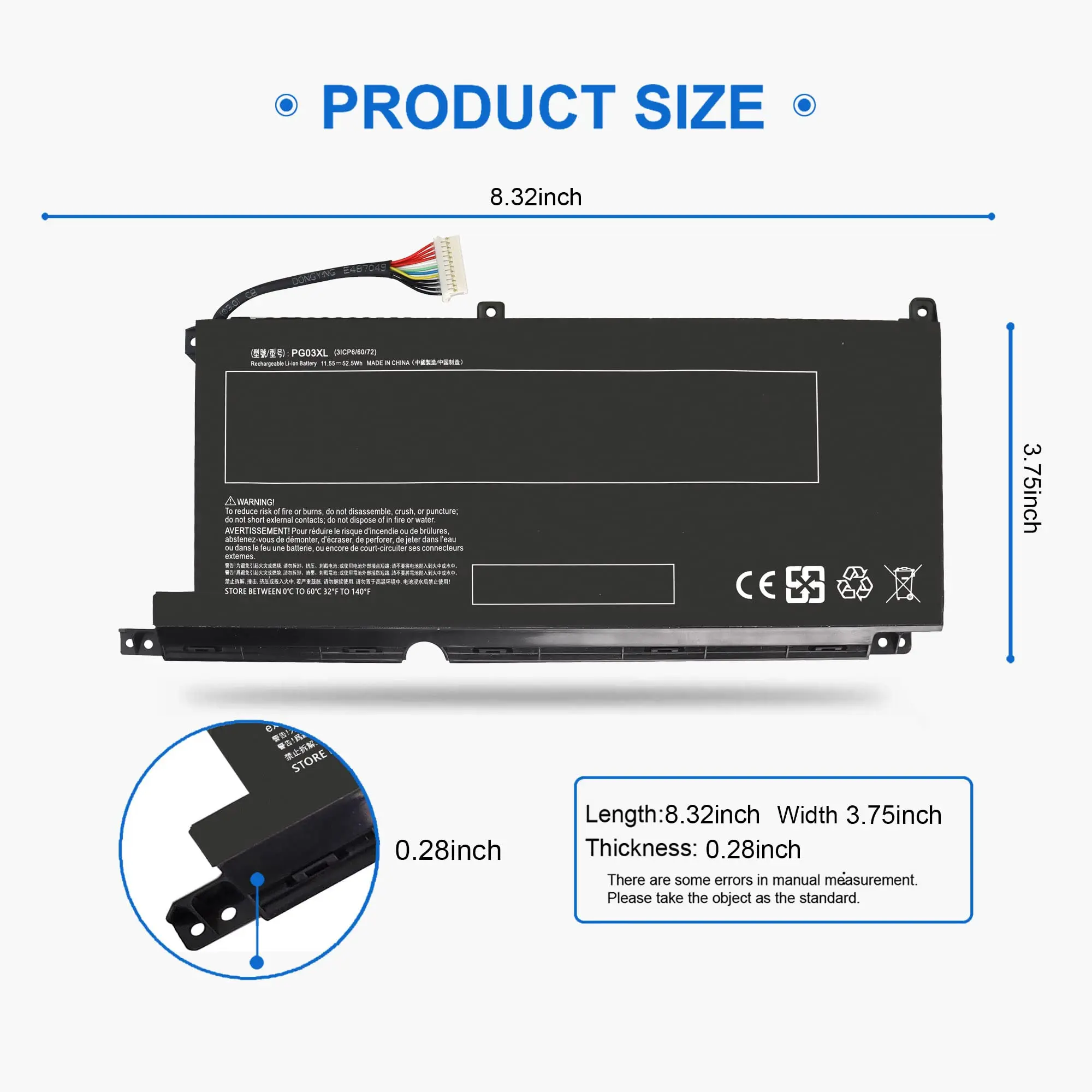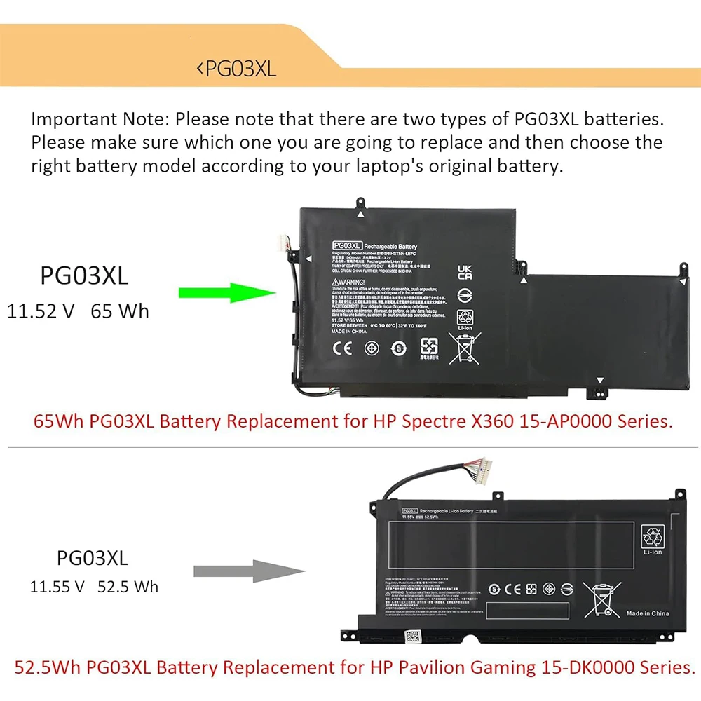 Nota: El PG03XL tiene dos tipos de batería diferentes: (PG03XL 52.5Wh) y (PG03XL 65Wh). Sus formas y modelos compatibles son diferentes. Antes de su compra, abra la tapa del portátil para verificar la forma de su batería original y los parámetros específicos. Nuestro producto es (PG03XL 52.5Wh).