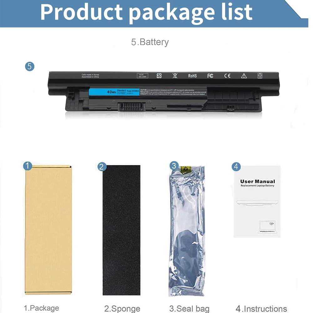 ESPECIFICACIONES: Modelo: Tipo XCMRD; Tipo de batería: Iones de litio; Voltaje: 14,8 V; Capacidad: 40Wh; Celdas: 4 celdas; Estado: Nuevo; El paquete incluye: 1 Batería para portátil.