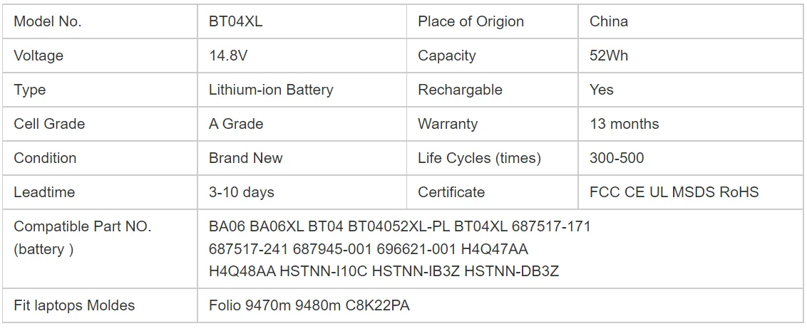 Comprar Batería para portátil HP EliteBook Folio 14,8 m 9470 BT04XL, 9470 V, 52WH, BT04, BT04XL, BA06, BA06XL, nueva