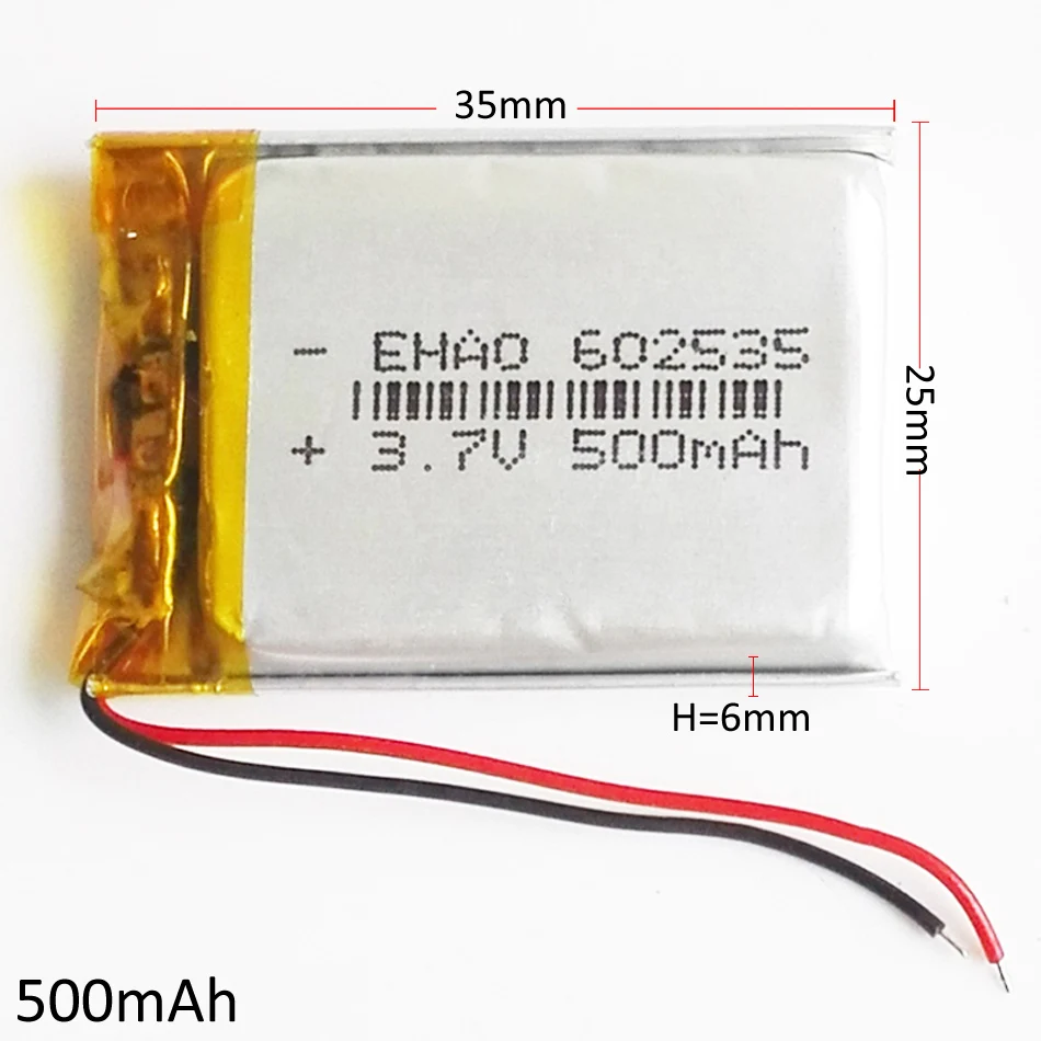 Características:1 100% nuevo2 ¡Alta calidad y alta capacidad!3 Puede durar más de 4 horas4 Circuito de protección incorporado PCM para evitar la sobrecarga o la sobredescarga5 Tamaño: 6mm(H)* 25mm(W)* 35mm(L)6 Clasificación: DC3.7V 500mAhMétodo de carga estándar: 0.5C CC (corriente constante) carga a 4,25 V, luego CV (voltaje constante 4,2 V) carga hasta que la corriente de carga sea menor o igual a 0.05C
