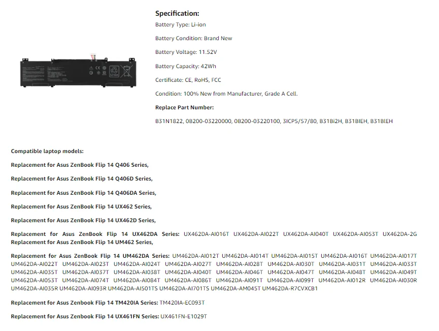 Comprar Batería recargable de polímero de litio para ordenador portátil Asus zenbook flip 14 UM462DA, B31N1822, 11,52 V, 42Wh