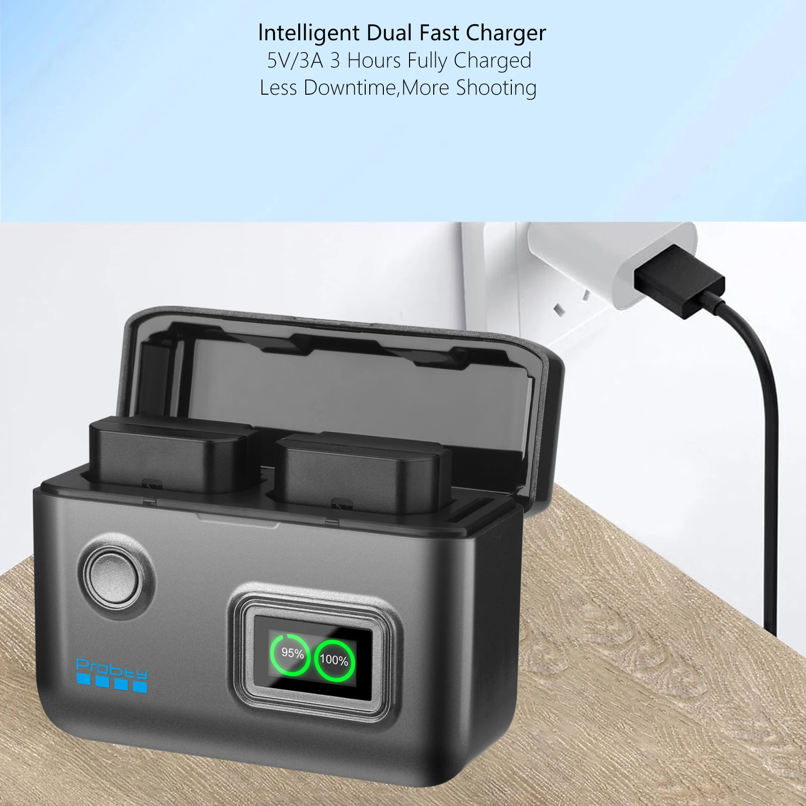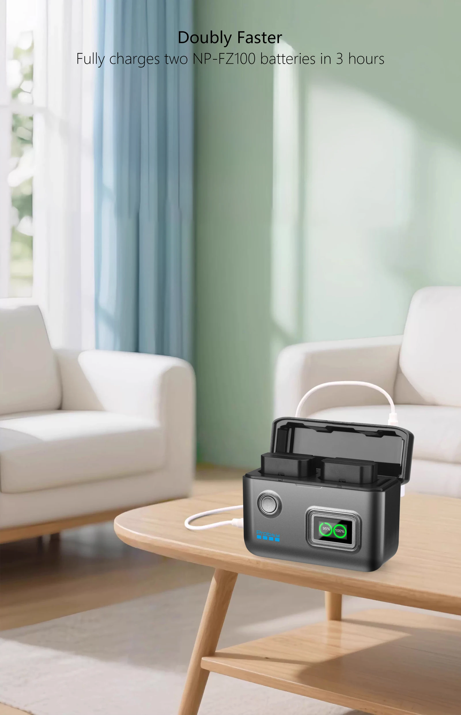 Introducción de la batería:Tipo de batería: Batería de litio recargableVoltaje de salida: CC 7,2 V (medio)Capacidad: 22,2 Wh/2600 mAhTemperatura de funcionamiento: 0 a 40 gradosParámetro del cargador rápido de 15 W:Entrada: 5V/3A 15WSalida: 8,4 V -1 A (x1)/0,75 A (X2)La parte frontal del cargador tiene interruptores de botón y una pantalla LCD.Encendido: La pantalla LCD está constantemente encendida.mostrando el nivel actual de la batería.Carga: Pantalla verde del nivel de batería parpadeante.Completo: la visualización verde del nivel de batería está llena.Batería de repuesto para Sony NP-FZ100:La batería es adecuada para Sony Alpha A7 III, A7 IV, A7S III, A7R III, A7R IV, A7R V, A7C,