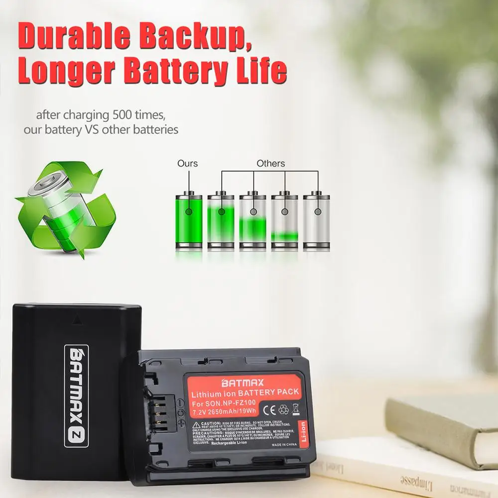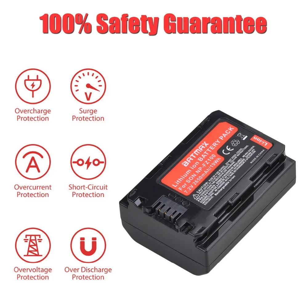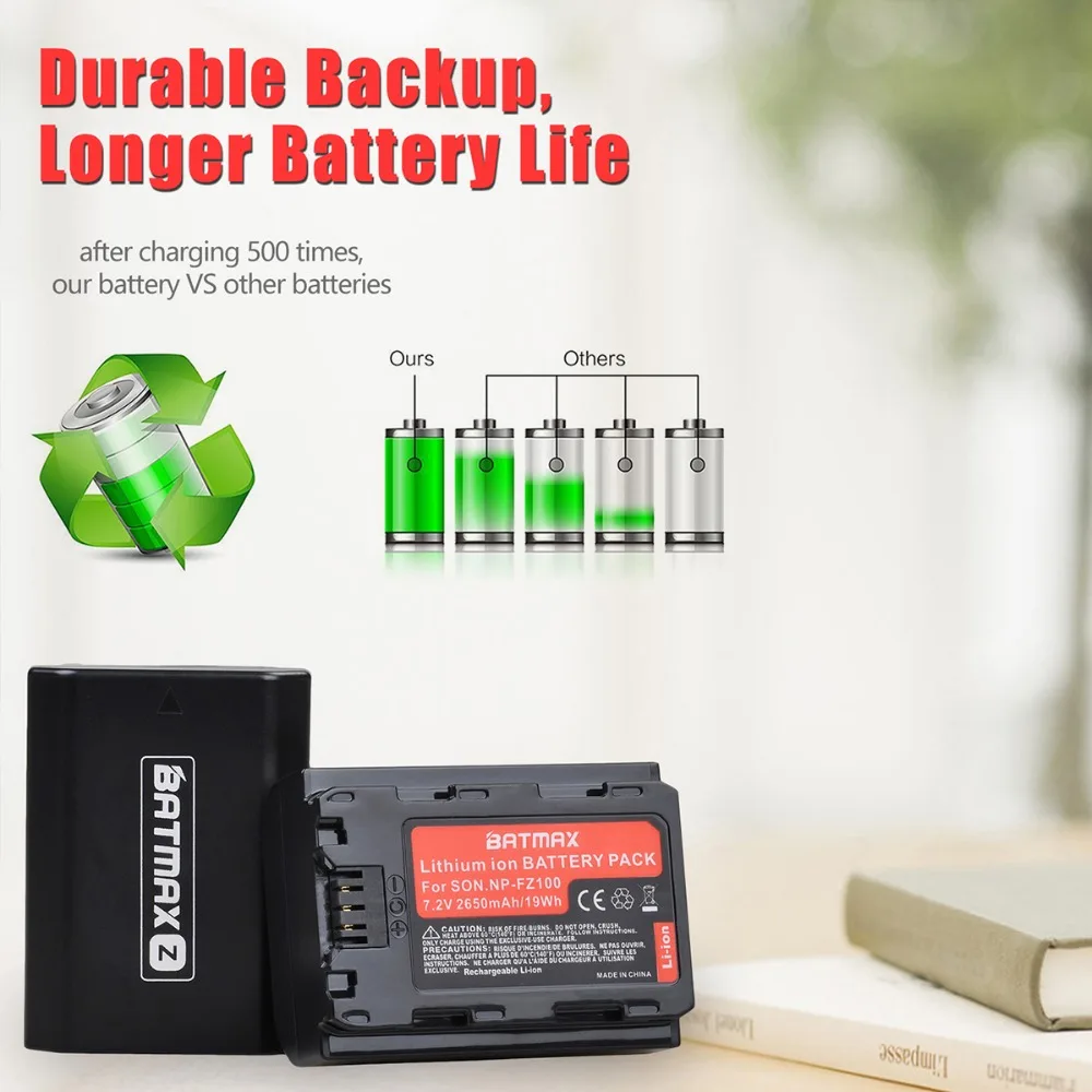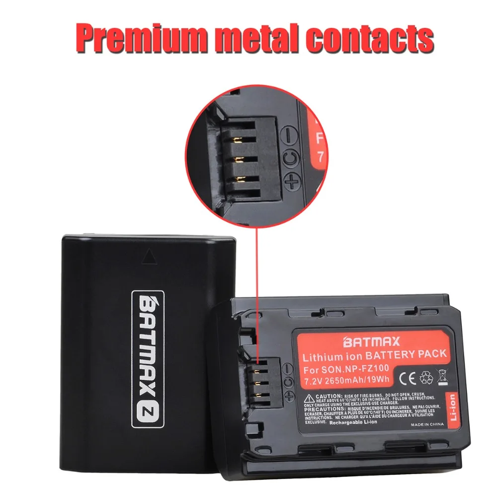 Batmax 2650mAh NP-FZ100 Bateria NP FZ100 Batería de cámara + LED Cargador USB dual para NPFZ100 Sony Alpha9, Sony A9, Sony Alpha9R, Sony A9R Cámara Sbatería a7 iii