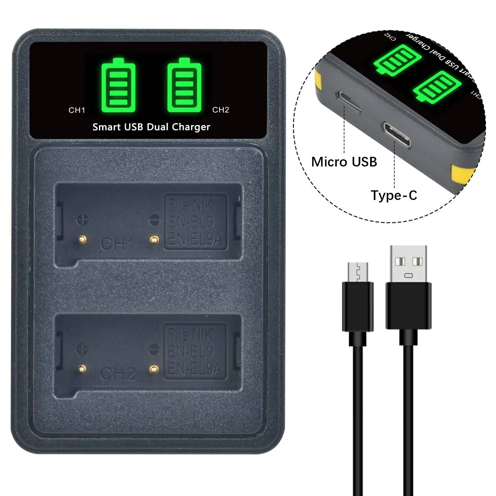 Batería de batería Batmax EN EL9 + cargador dual USB LED para cámara Nikon D40 D60 D40X D5000 D3000, 2 unidades