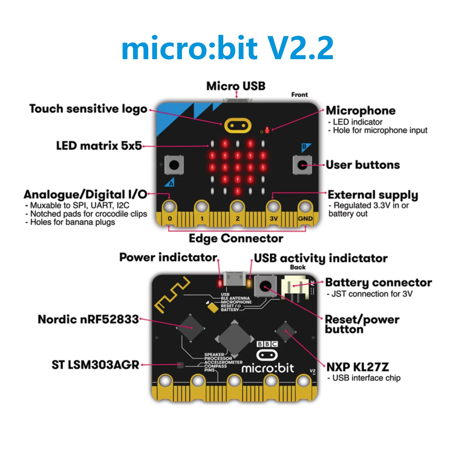 Comprar BBC Micro:Bit V2.2 programa de placa educativa DIY altavoz integrado, acelerómetro, micrófono MEMS, radio 2,4 GHz/BLE 5,0