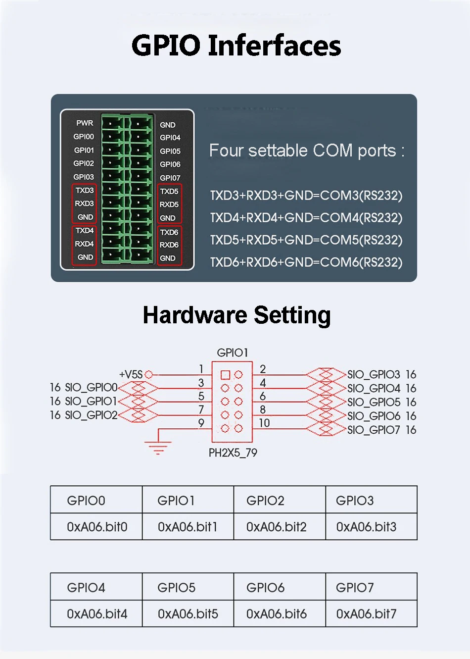 7.En el puerto GPIO se pueden configurar cuatro puertos COM (RS232)