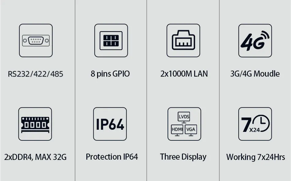 6.Interfaz de PC: 4*USB2.0, 4*USB3.0, 2*LAN, VGA, HDMI, WIFI, ranura SIM, 1*GPIO, MIC/SPK