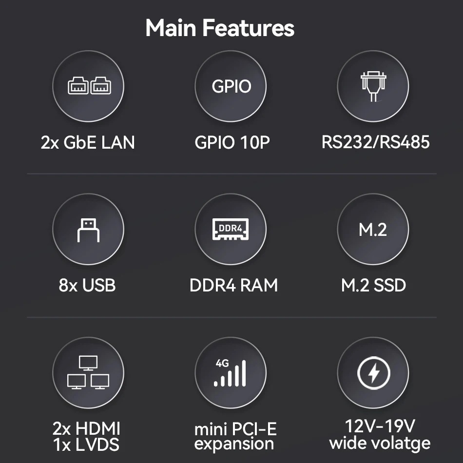 (7) GPIO, 4x COM RS232 ( COM1 soporte RS232/RS485 ajustable)