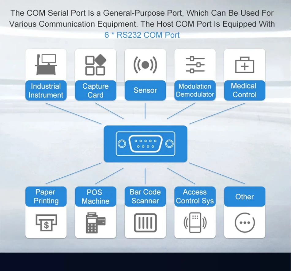 6 x RS232 DB9 (CONFIGURACIÓN POR DEFECTO COM 1 a COM 6)