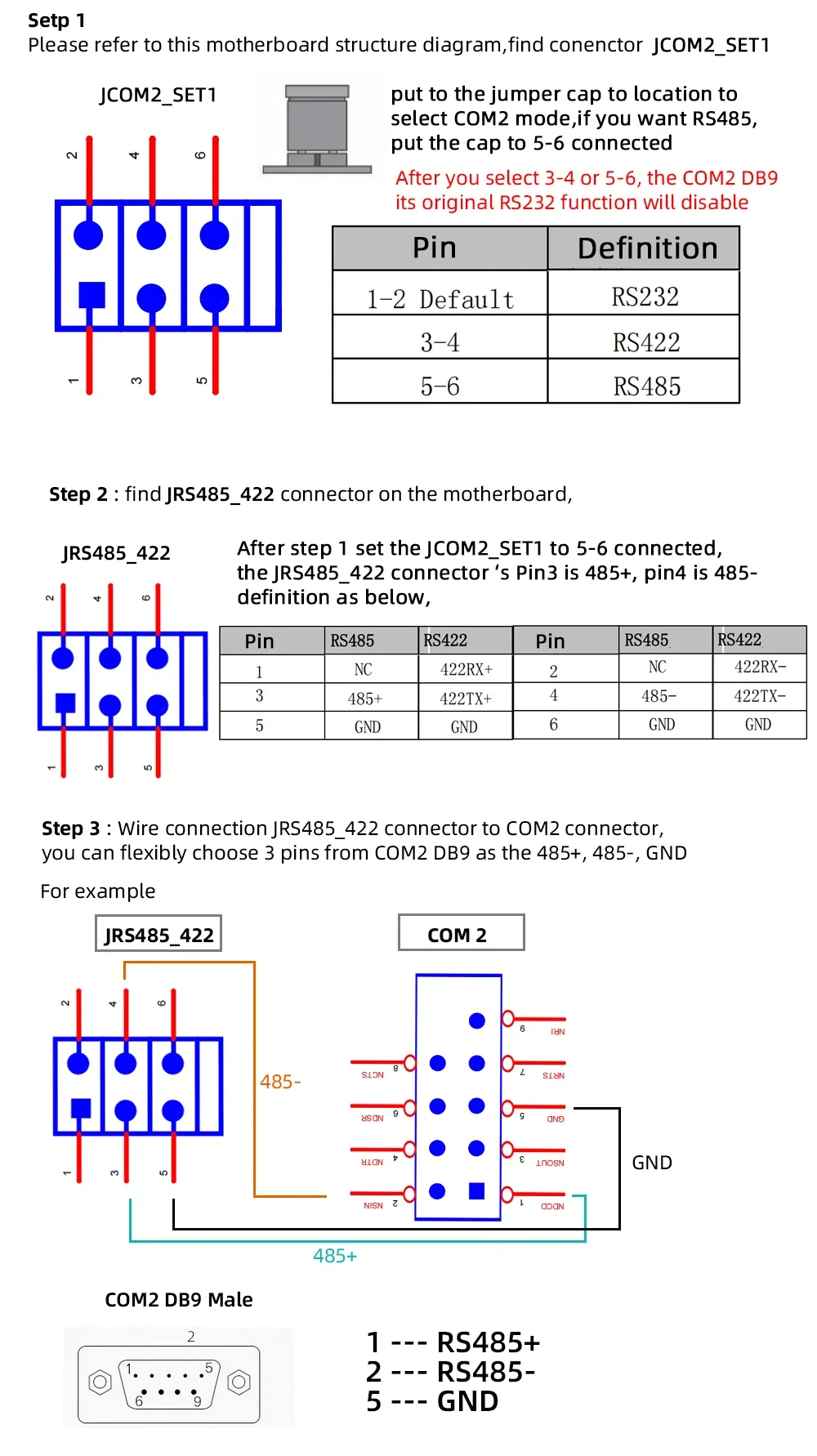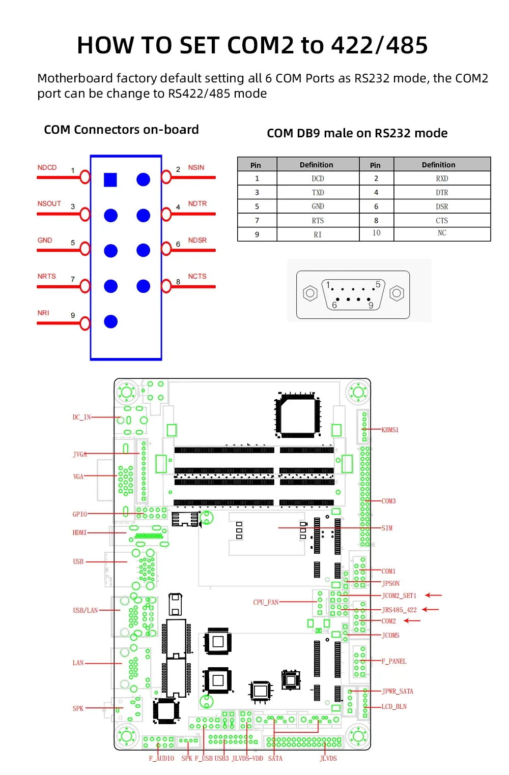 3) La configuración predeterminada de COM1 a COM6 DB9 es modo RS232, COM2 admite ajuste a modo RS422 o RS485.