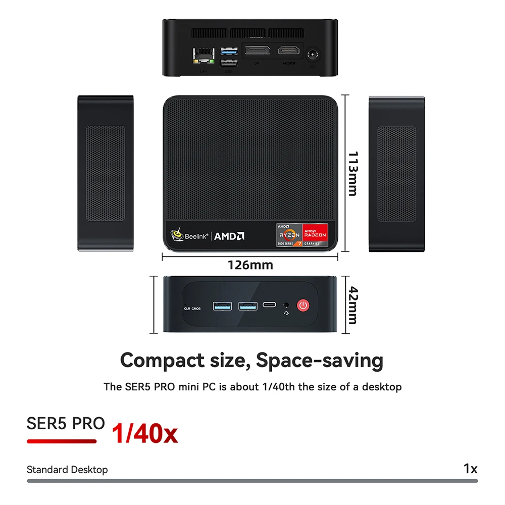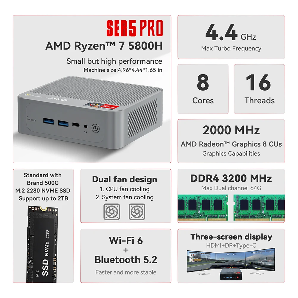 Comprar Beelink-Mini PC SER5 con WiFi 6E, Windows 11 Pro, AMD Ryzen 7, 5800H, DDR4, 16GB, 500GB, SSD, BT5.2, 4K, 60Hz, Dual, 1000M