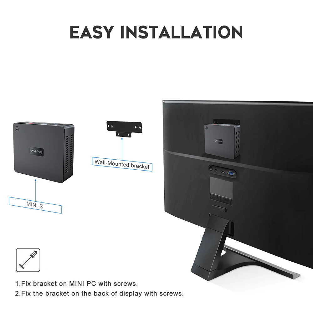 [Multifunctional Supports] Beelink mini s features a variety of interface designs (4*USB3.0, 2*HDMI, 1*RJ45 1000M LAN, 1*Audio jack (HP & Mic), 1*DC jack), comes with a wall bracket to allow you to hang mini computers behind the monitor.