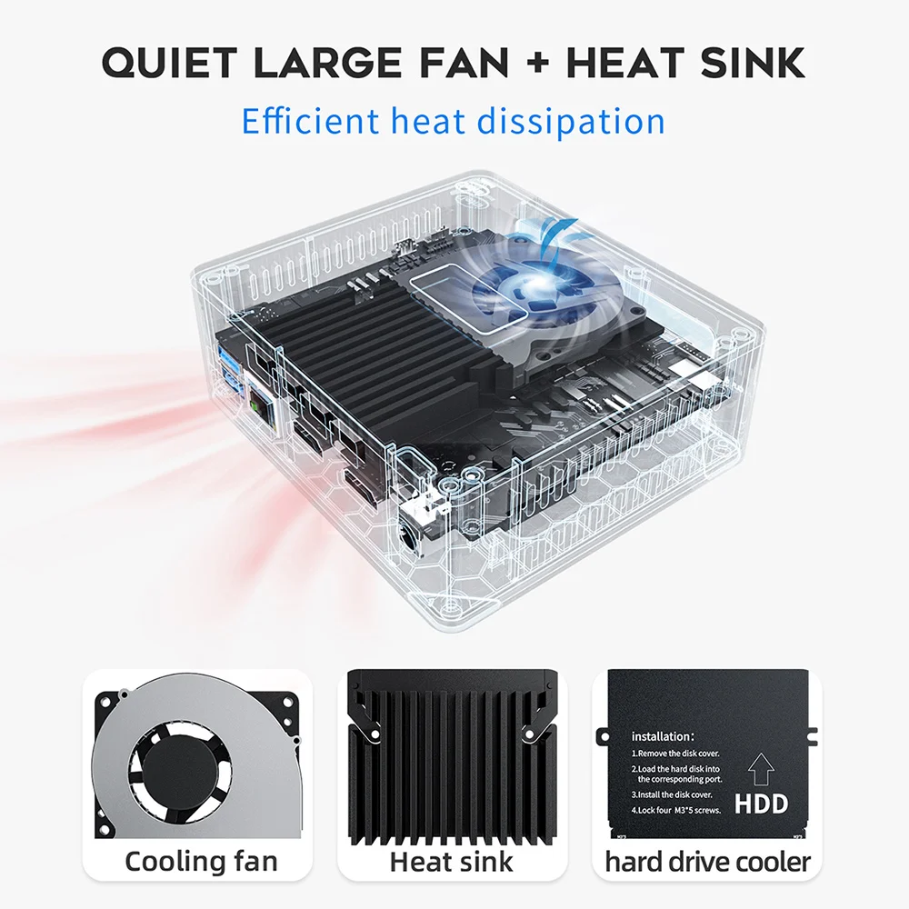 【Disipación de calor eficiente y múltiples interfaces】El fantástico ventilador de refrigeración integrado Beelink MINI S12 Pro, el disipador de calor y el enfriador del disco duro ayudan a enfriar el hardware y reducir la pérdida de hardware, brindando una velocidad de respuesta más rápida.La mini computadora presenta una variedad de diseños de interfaces (4*USB3.2 Gen2 10Gbps, 2*HDMI 4K 60Hz, 1*RJ45 1000M LAN, 1*Audio jack, 1*DC jack), satisface fácilmente las necesidades de negocios de oficina, audio y vídeo para el hogar. necesidades.