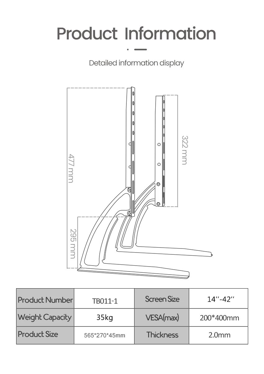 Compatibilidad de tamaño de TV:TB011-1Capacidad para televisores de 14 " - 42" y un peso de hasta 35kg/