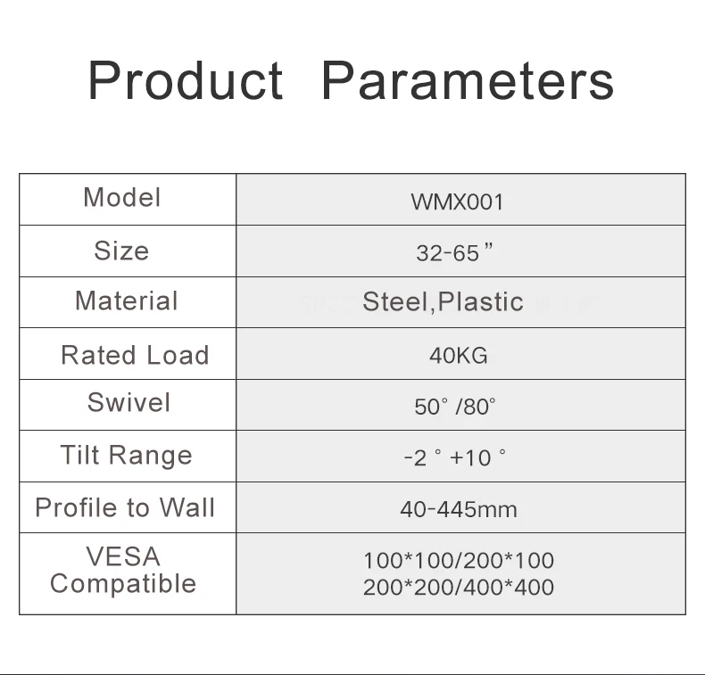 CARACTERÍSTICA : * La cubierta de la placa de pared y el sistema oculto de cable del soporte de TV se ven más lujosos y agradables, también hacen que el cable de TV detrás de su TV sea ordenado.* Con este soporte de TV de movimiento completo, puede ser fácil de arreglar, inclinar, extender, plegar y girar su televisor y cualquier ángulo de visión que desee.* El diseño de tecnologías avanzadas hace que el ángulo de visión sea fácil y conveniente.* Nuestros accesorios estándar le permiten ampliar la distancia de montaje de TV VESA de 200*200mm a 400*400mm.* El brazo puede extenderse hasta 445mm como máximo y 40mm como mínimo