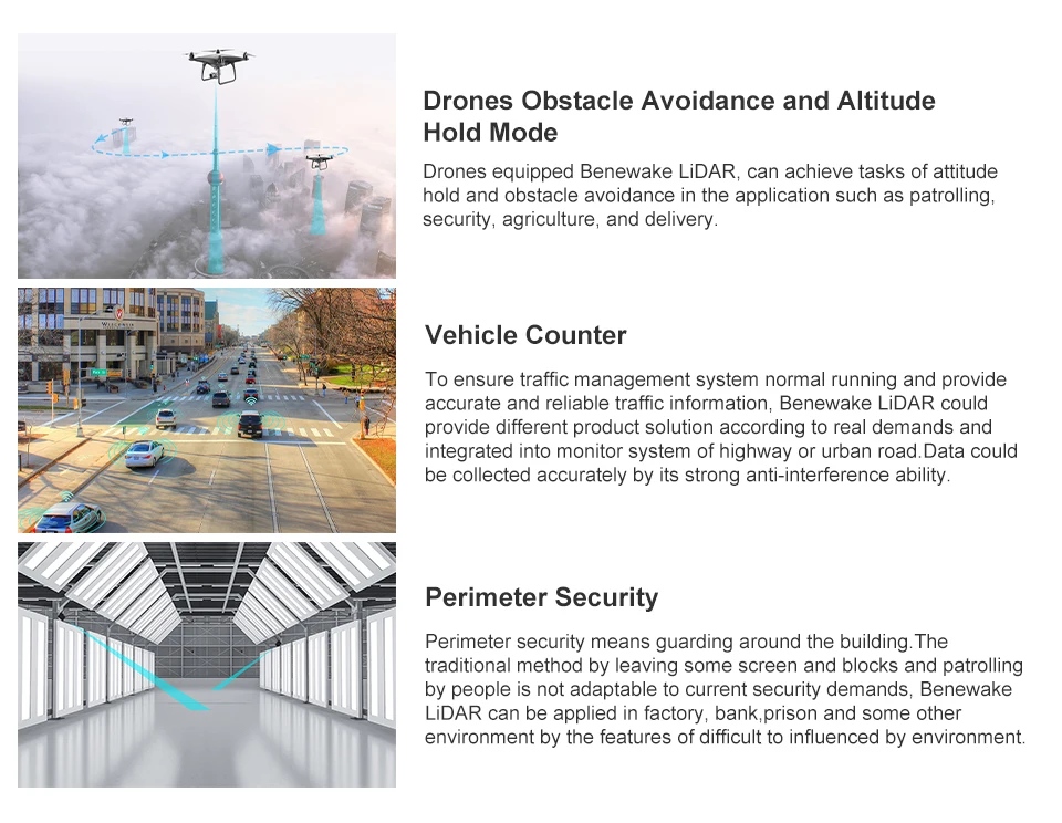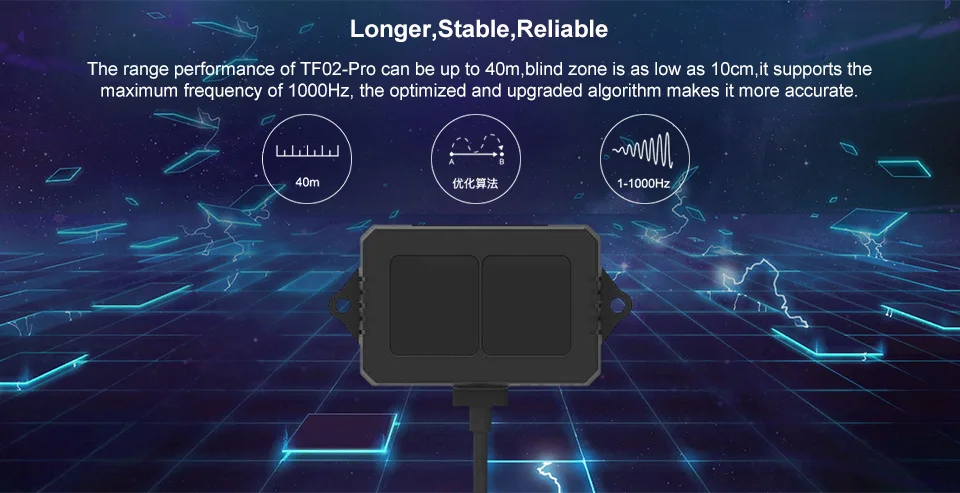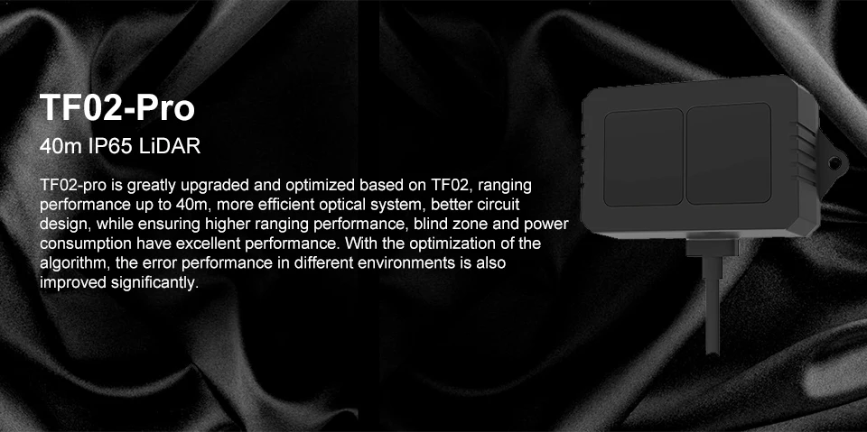 1.Descripción del productoTF02-Pro es un LiDAR de alcance de un solo punto basado en la actualización de TF02.Se mejoran el rendimiento y la precisión de diferentes reflectividad y pueden lograr una detección de rango de frecuencia estable, precisa, sensible y de alta frecuencia.Características principales del producto:?El alcance de hasta 40 metros.?Resistencia a la luz ambiental (hasta 100Klux)?Alta velocidad de fotogramas (hasta 1000 Hz)?Bajo consumo de energíaAplicaciones principales:?Tráfico inteligente?Estacionamientos inteligentes?Monitoreo del nivel de material?UAV