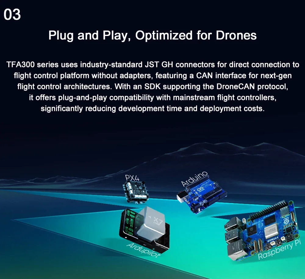 La serie TFA300 utiliza conectores JST GH estándar de la industria para una conexión directa a la plataforma de control de vuelo sin adaptadores, con una interfaz CAN para arquitecturas de control de vuelo de próxima generación.Con un SDK que admite el protocolo DroneCAN, ofrece compatibilidad plug-and-play con los controladores de vuelo convencionales, lo que reduce significativamente el tiempo de desarrollo y los costos de implementación.