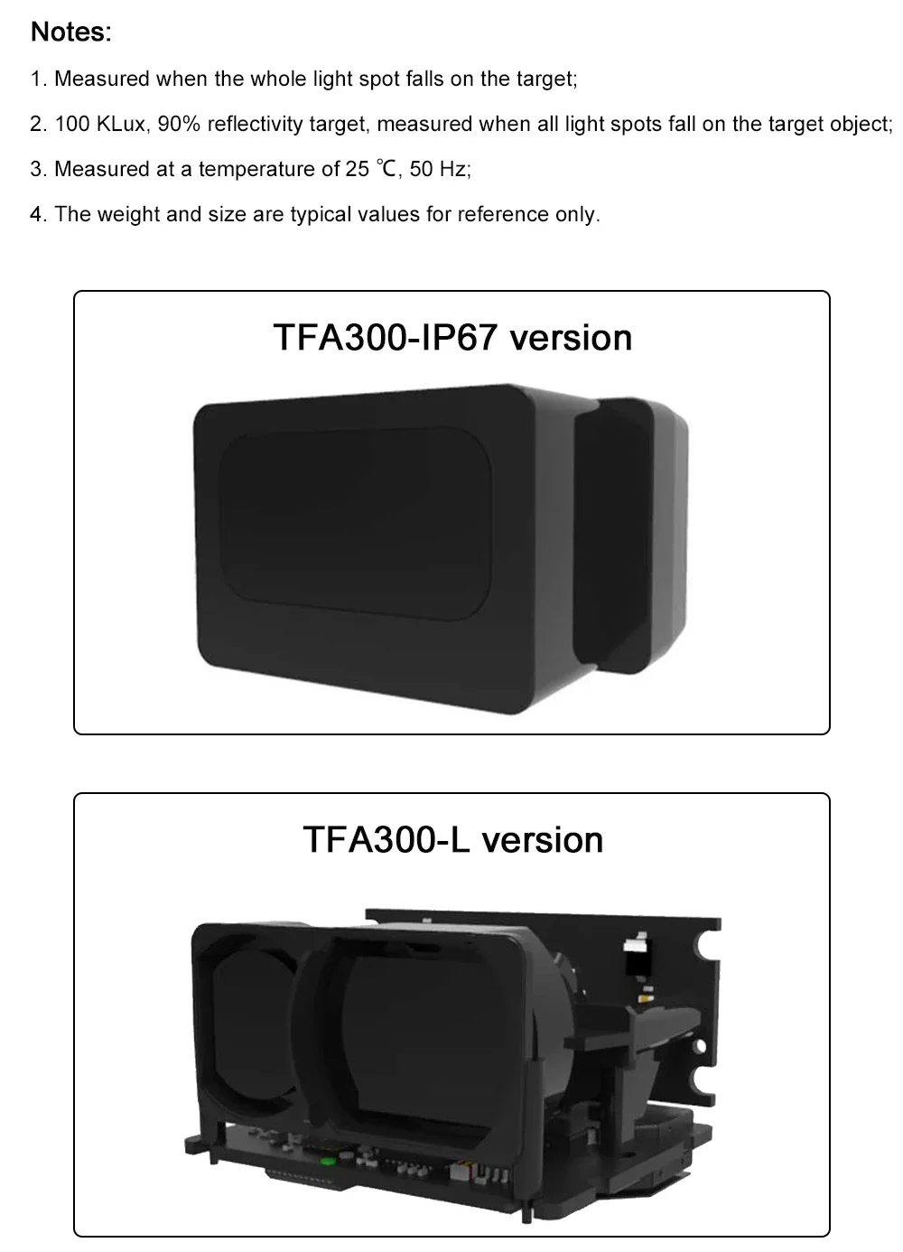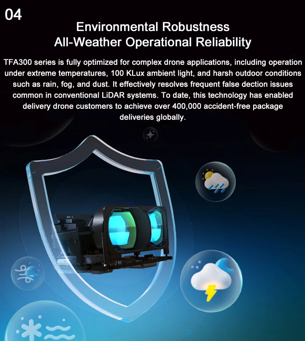La serie TFA300 está totalmente optimizada para aplicaciones complejas de drones, incluido el funcionamiento bajo temperaturas extremas, luz ambiental de 100 KLux y condiciones exteriores adversas como lluvia, niebla y polvo. Resuelve eficazmente los frecuentes problemas de falsas decciones comunes en los sistemas LiDAR convencionales. Hoy en día, esta tecnología ha permitido que los clientes de drones logren más de 400.000 entregas de paquetes sin accidentes a nivel mundial.