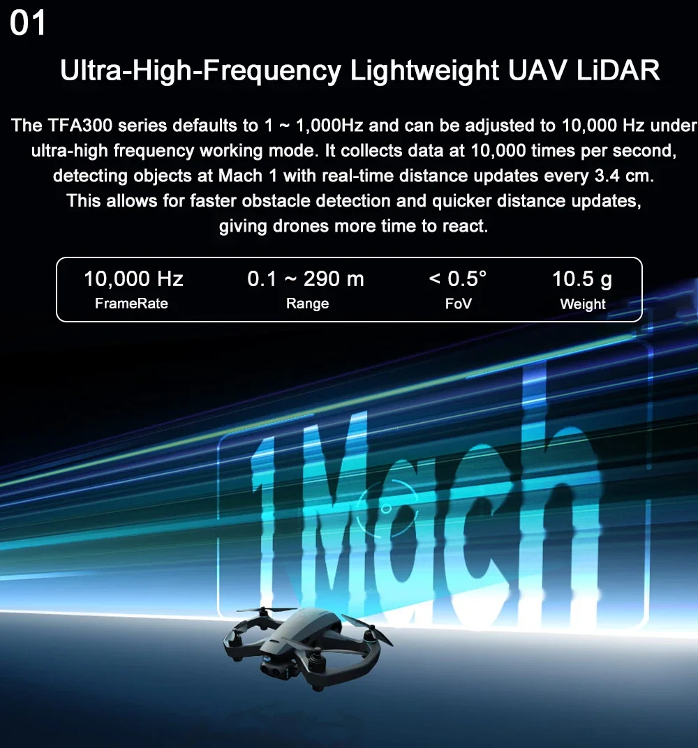 La serie TFA300 tiene por defecto 1 ~ 1.000 Hz y se puede ajustar a 10.000 Hz en modo de trabajo de frecuencia ultraalta.Recopila datos en 10.000 veces por segundo, detectando objetos en Mach 1 con actualizaciones de distancia en tiempo real cada 3,4 cm. Esto permite una detección de obstáculos más rápida y actualizaciones de distancia más rápidas, brindando a los drones más tiempo para reaccionar.