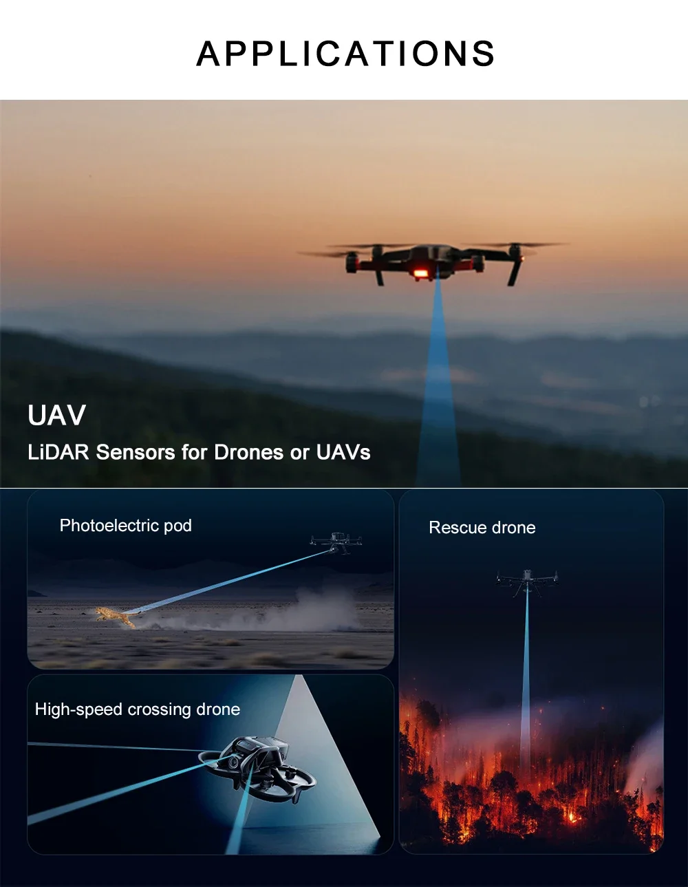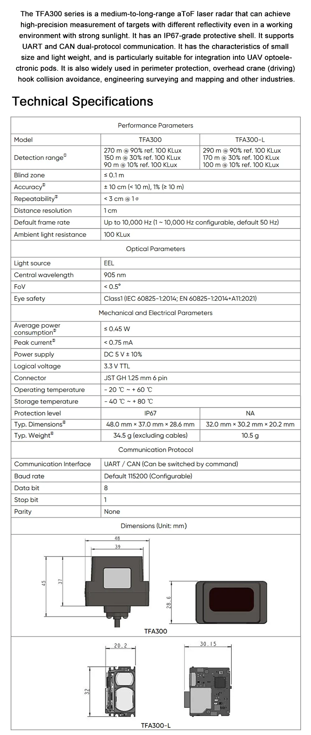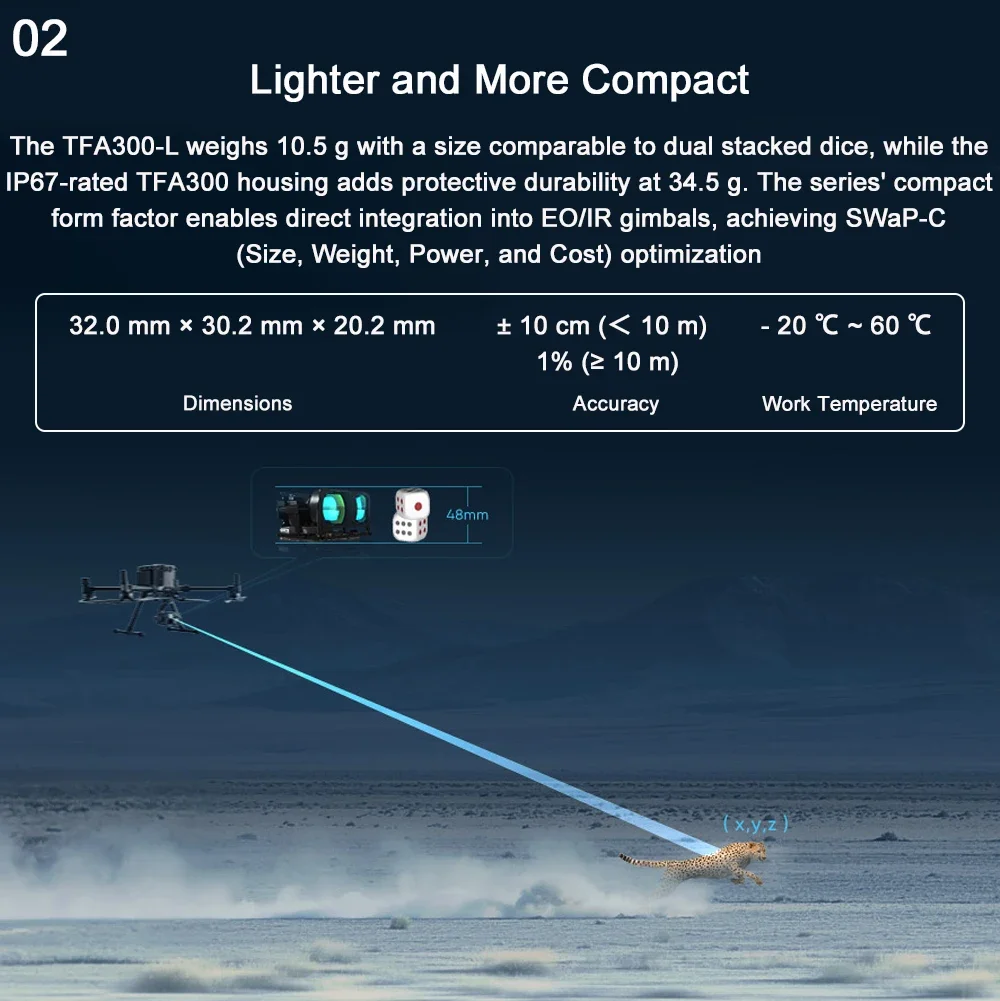 La serie TFA300 incluye la versión ultraligera TFA300-L sin carcasa y la TFA300 con carcasa protectora IP67.Ambos modelos cuentan con una alta frecuencia de hasta 10.000 Hz.En aplicaciones como Gimbals electroópticos/infrarrojos (EO/IR), SAR (drone y rescate) y Utra Drone de carreras FPV de alta velocidad, la serie TFA300 facilita el ajuste automático de la distancia focal de la cámara, la localización precisa y el mantenimiento de altitud estable durante crucero y evitación de obstáculos durante el vuelo de alta velocidad.