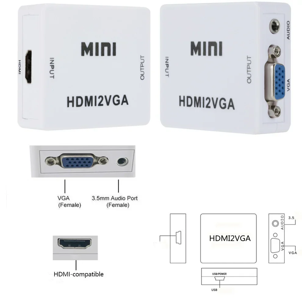 El Mini HDMI compatible con VGA es un convertidor de vídeo de alta definición que convierte la señal digital compatible con HDMI en señal analógica VGA y señal de audio analógica.Conexión de señales compatible con HDMI para PS3 para XBOX360, DVD Blue-ray, decodificadores HD, pantalla CRT/LED, etc.Puede ver fácilmente videos HD en el televisor normal sin una interfaz compatible con HDMI.