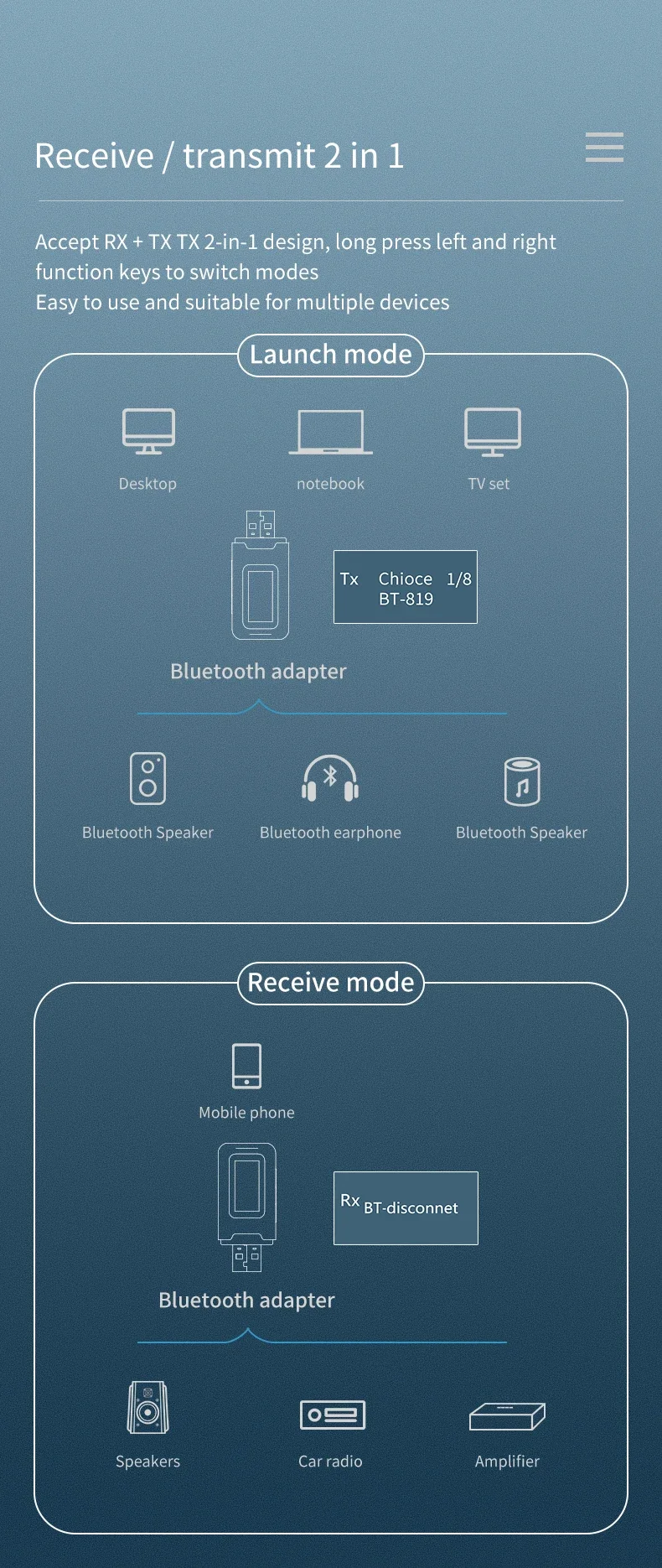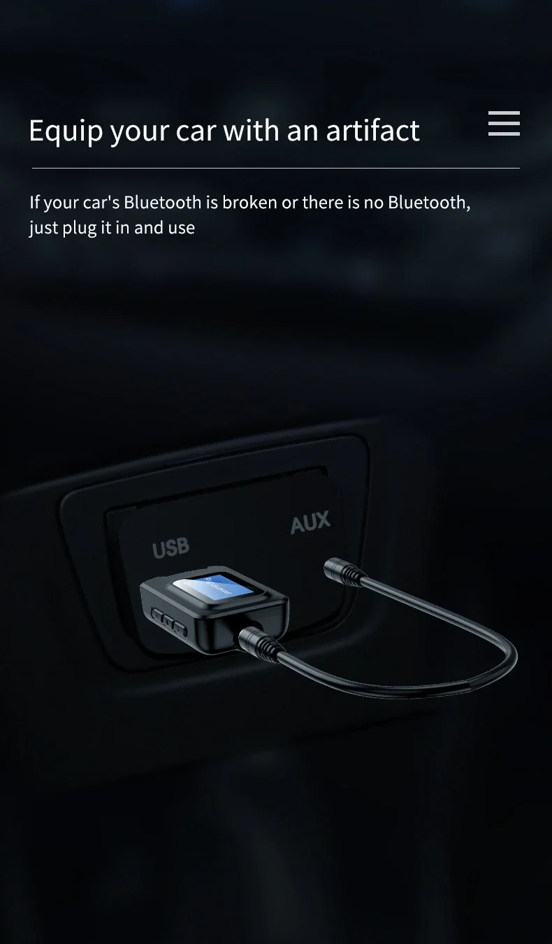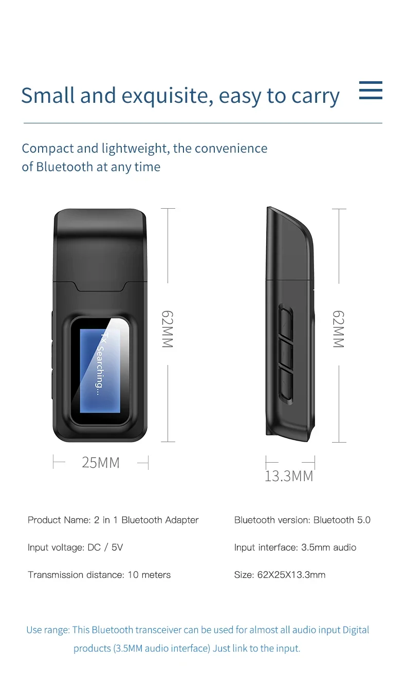 Modos: Modo de transmisor: La nueva actualización agrega una pantalla LCD, que puede buscar y mostrar simultáneamente 8 dispositivos Bluetooth cercanos para que pueda conectarse, más intuitivo y conveniente de usar. Modo de recepción: en el modo de recepción, puede ajustar el volumen, reproducir canciones arriba y abajo, etc.