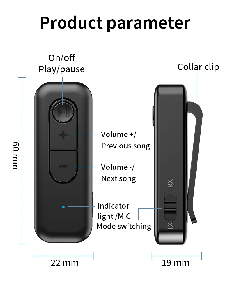 (5). Diseño práctico y portátil: ligero y cómodo con un clip elástico tipo prensa. El adaptador auxiliar BT para coche se puede transportar y utilizar fácilmente como receptor, actualizando los auriculares con cable a capacidad inalámbrica. La interfaz AUX universal de 3,5mm lo hace compatible con varios dispositivos de audio.2. Instrucciones de uso:(1). Modo receptor