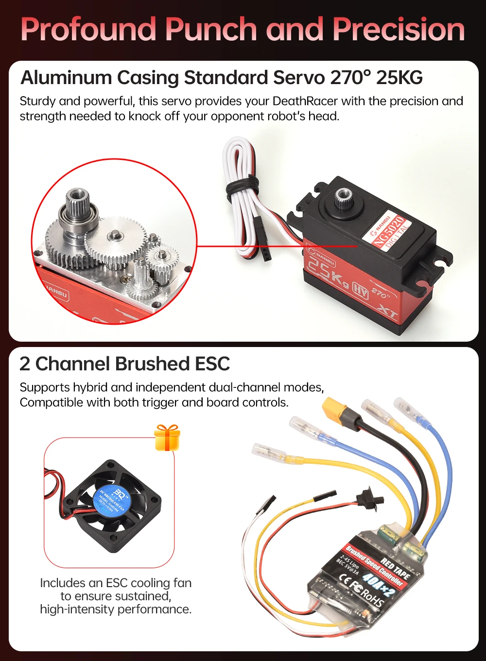 Robusto y potente, este servo proporciona a tu DeathRacer la precisión y la fuerza necesarias para derribar la cabeza del robot oponente.