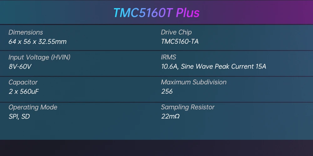 Admite hasta 60V, 10,6A IRMS y 15A de corriente sinusoidal máxima, TMC5160T Plus aumenta las velocidades de impresión, mejora la precisión y ACCIONA motores de alta potencia, llevando sus proyectos de impresión 3D a nuevos niveles de calidad y eficiencia.